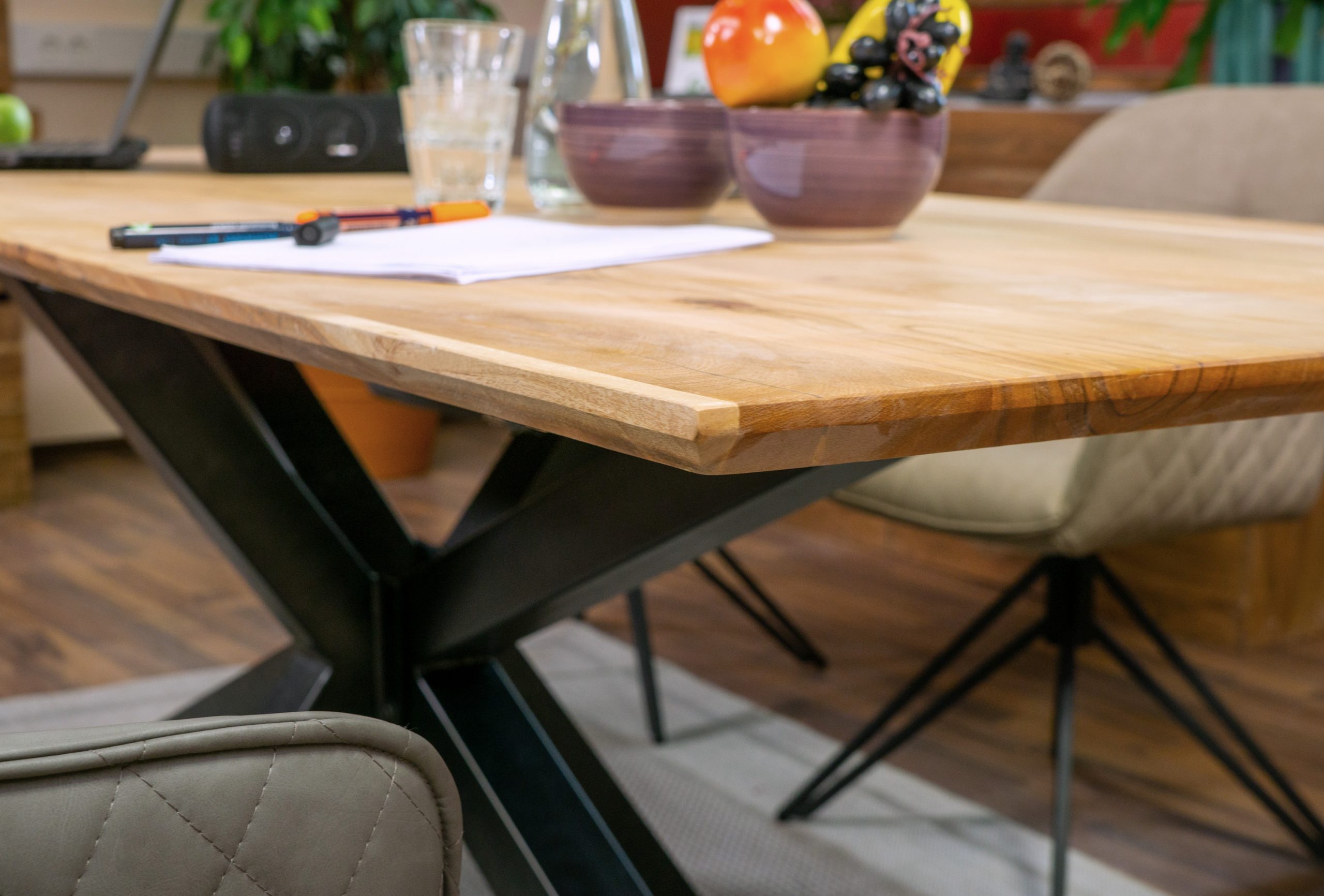 26 mm starke Tischplatte – mit edler Schweizer Kante im eleganten, schwebenden Design.