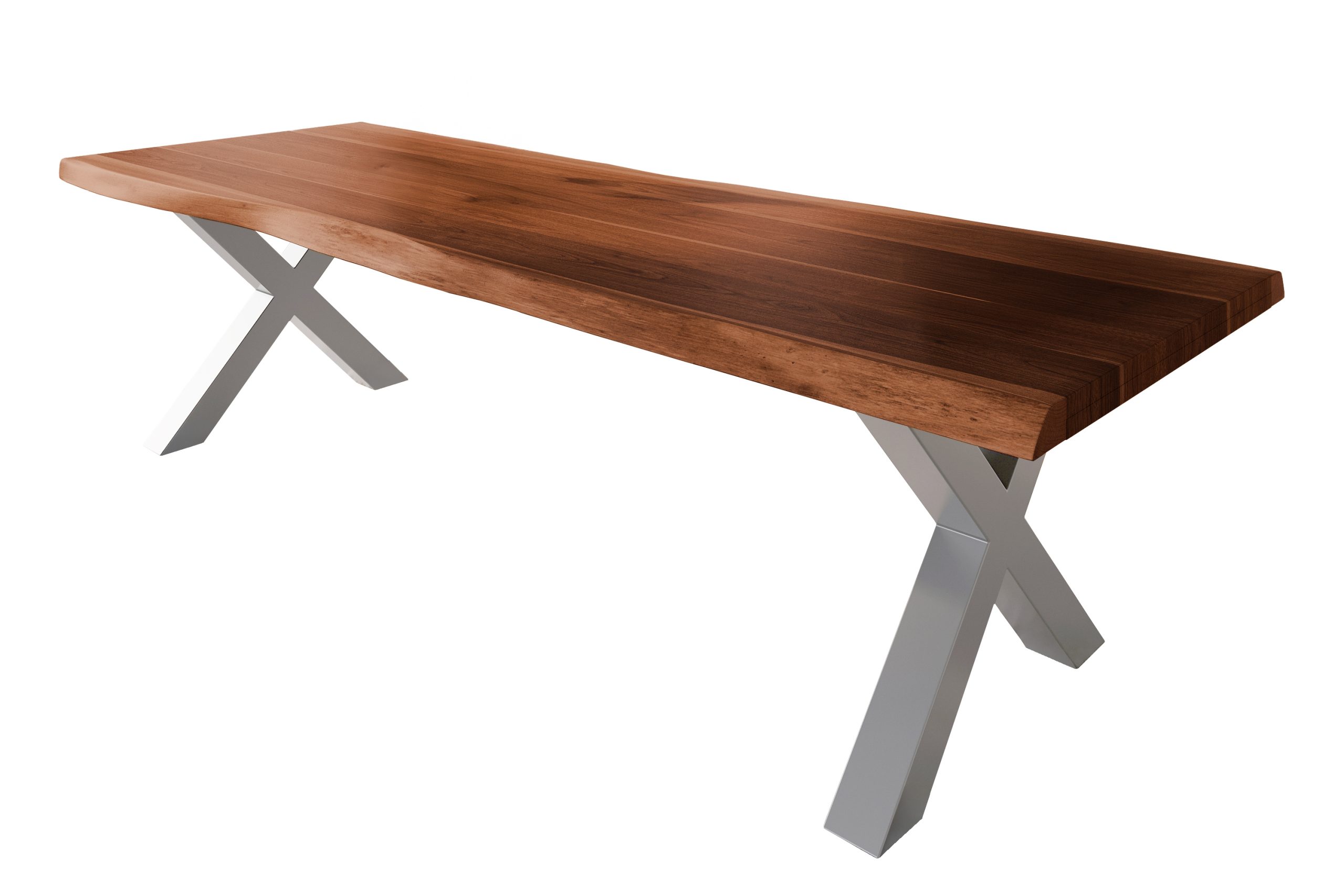 Esszimmertisch Atlas, 260 x 100 cm, massives Akazienholz nussbaumfarben, echte Baumkante, X-Gestell aus Metall Silber