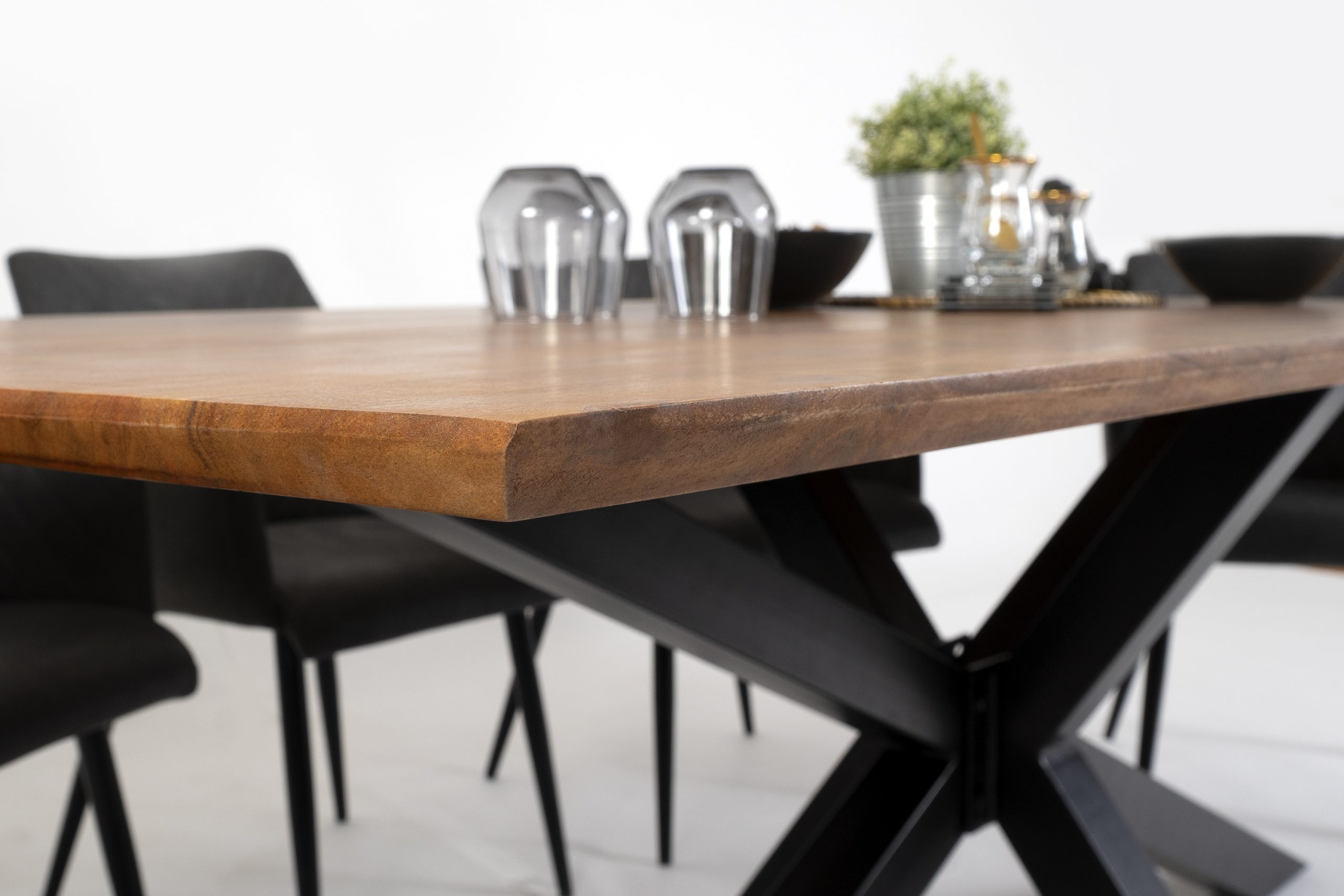 Esstisch Abby | 260 x 100 cm | Akazienholz massiv + nussbaumfarben | 26 mm Tischplatte mit Schweizer Kante | Spider-Gestell Schwarz