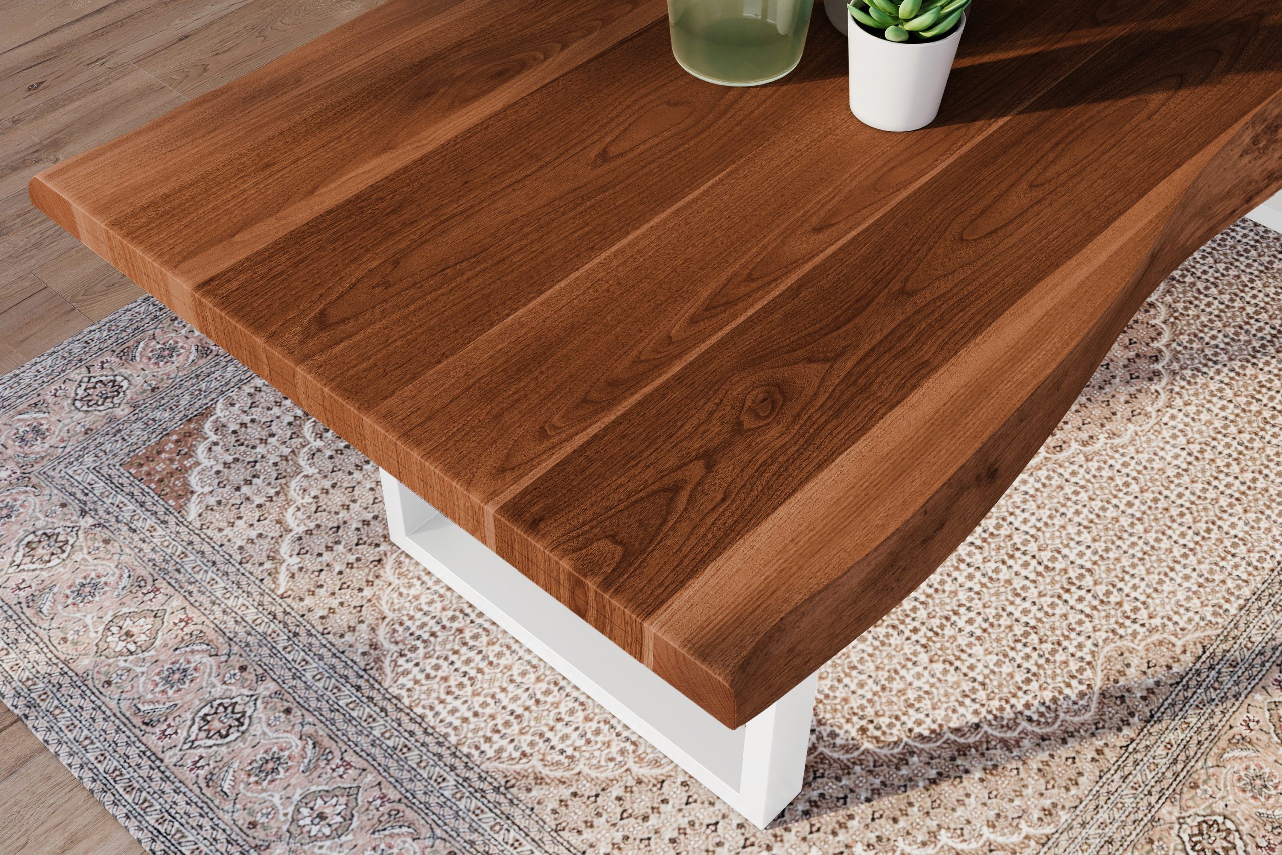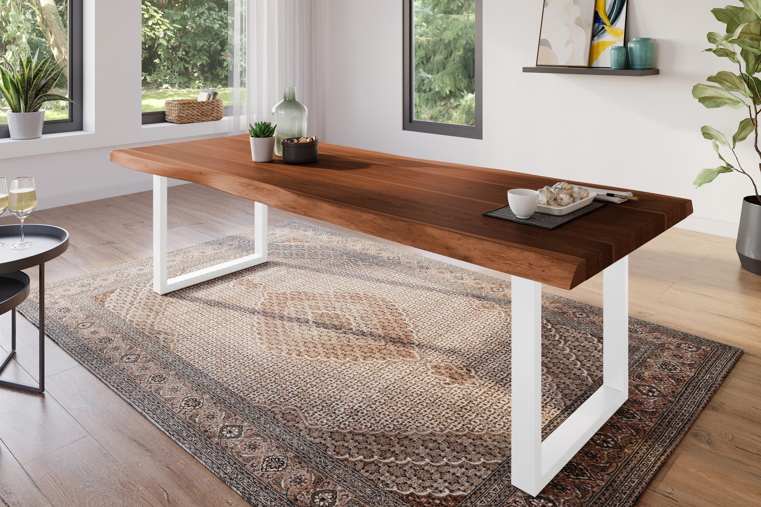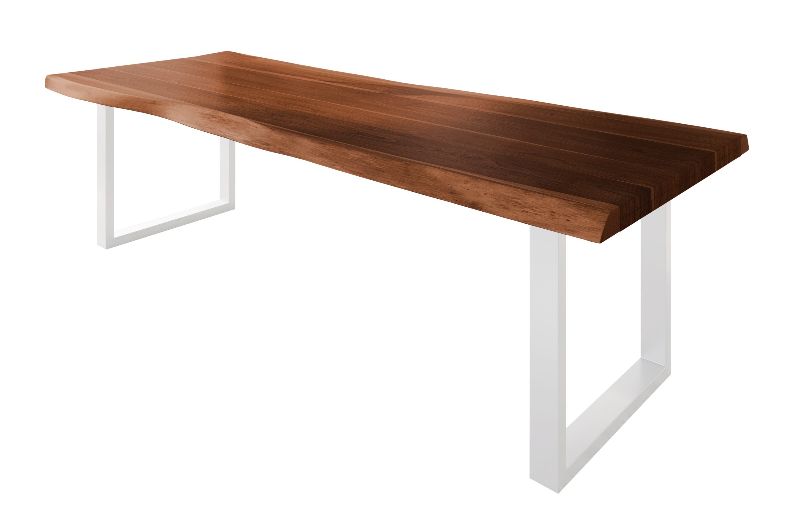 Esszimmertisch Atlas, 280 x 100 cm, massives Akazienholz nussbaumfarben, echte Baumkante, U-Gestell aus Metall Weiß