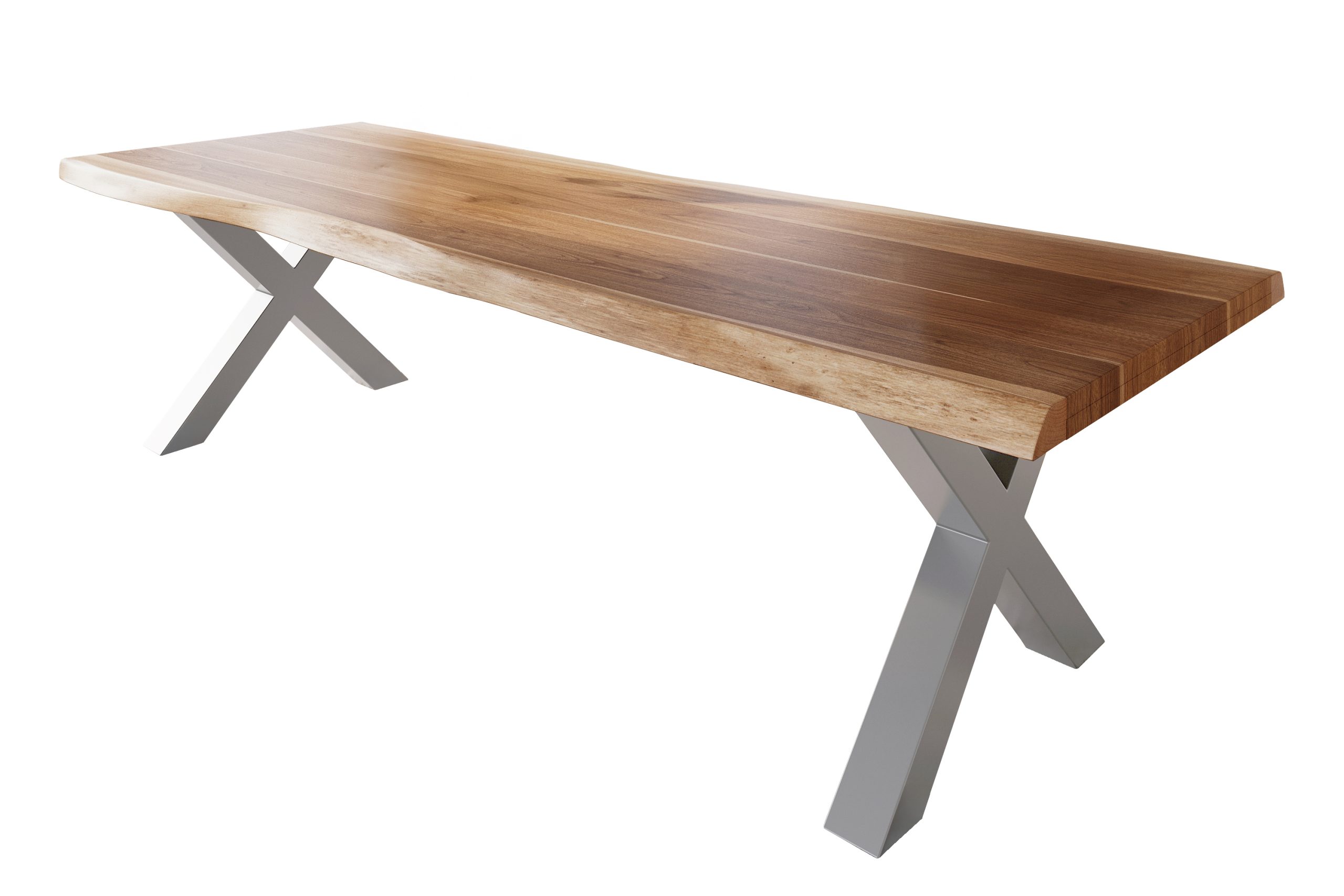 Esszimmertisch Atlas, 300 x 100 cm, massives Akazienholz naturfarben, echte Baumkante, X-Gestell aus Metall Silber
