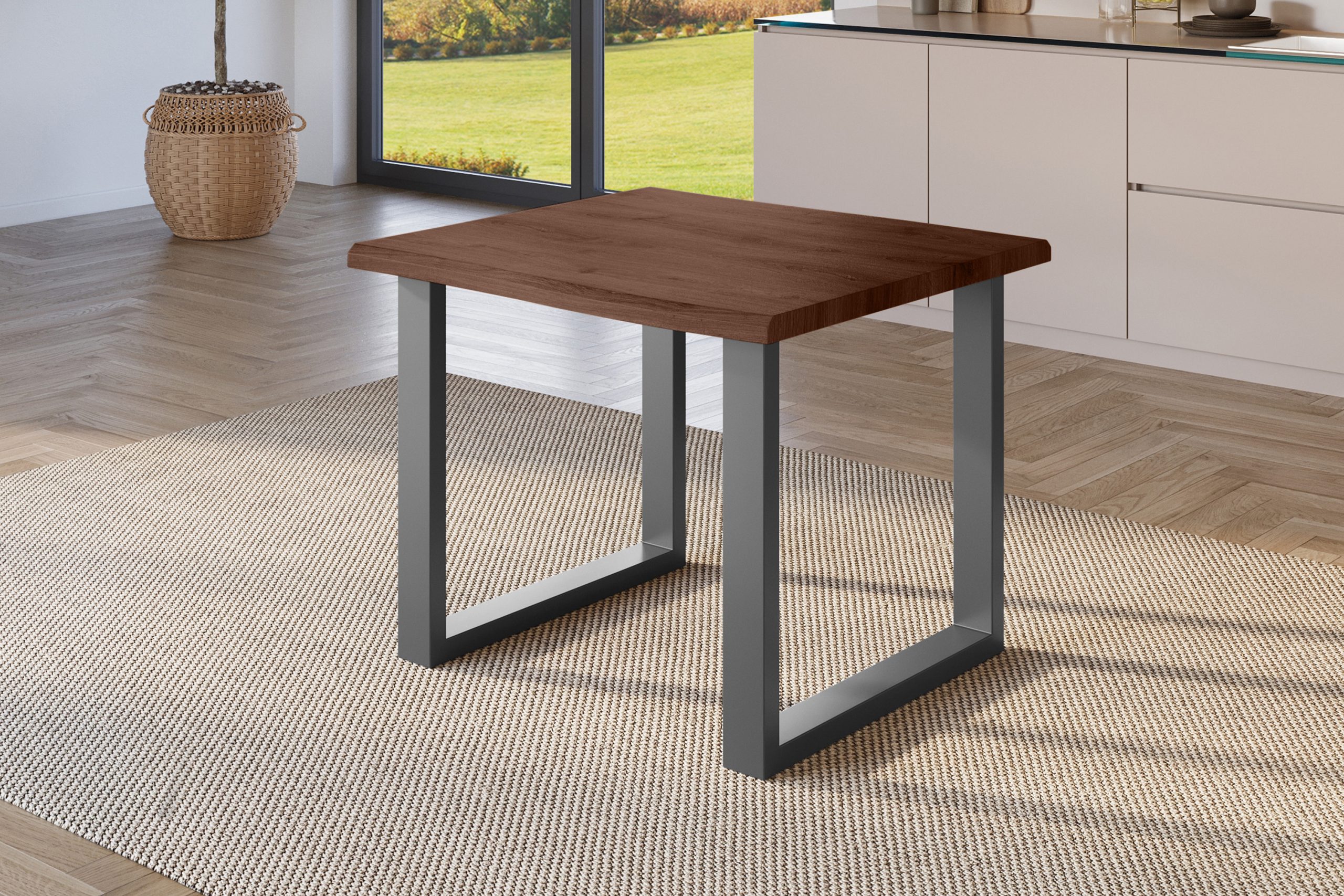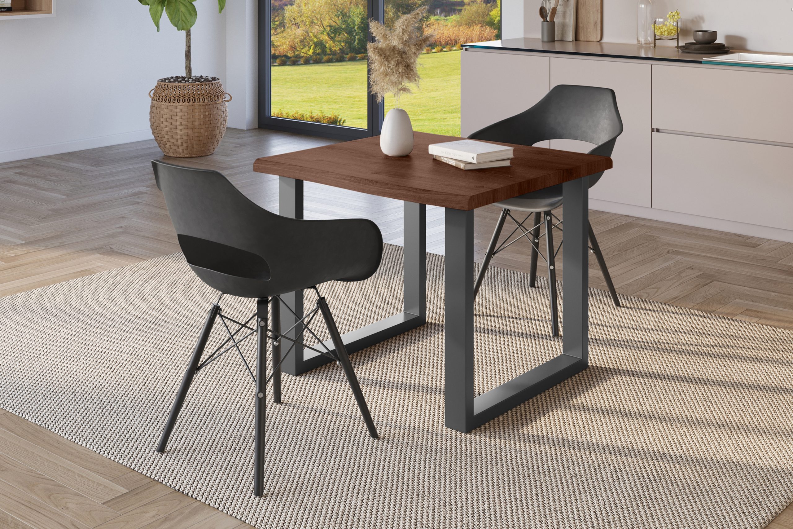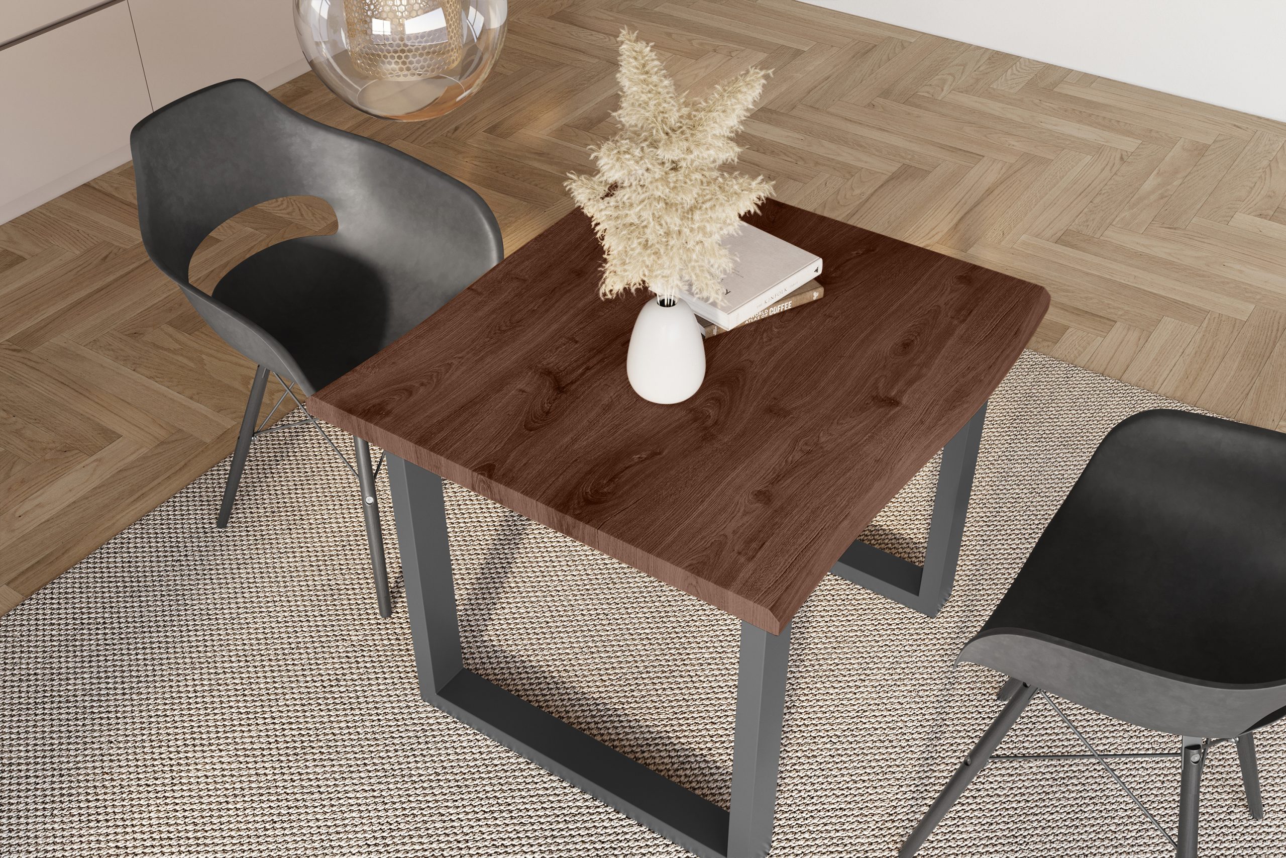 Esstisch Julius | 80 x 80 cm | Holz Nussbaum-Optik | U-Gestell Schwarz | 40 mm Tischplatte mit Baumkante
