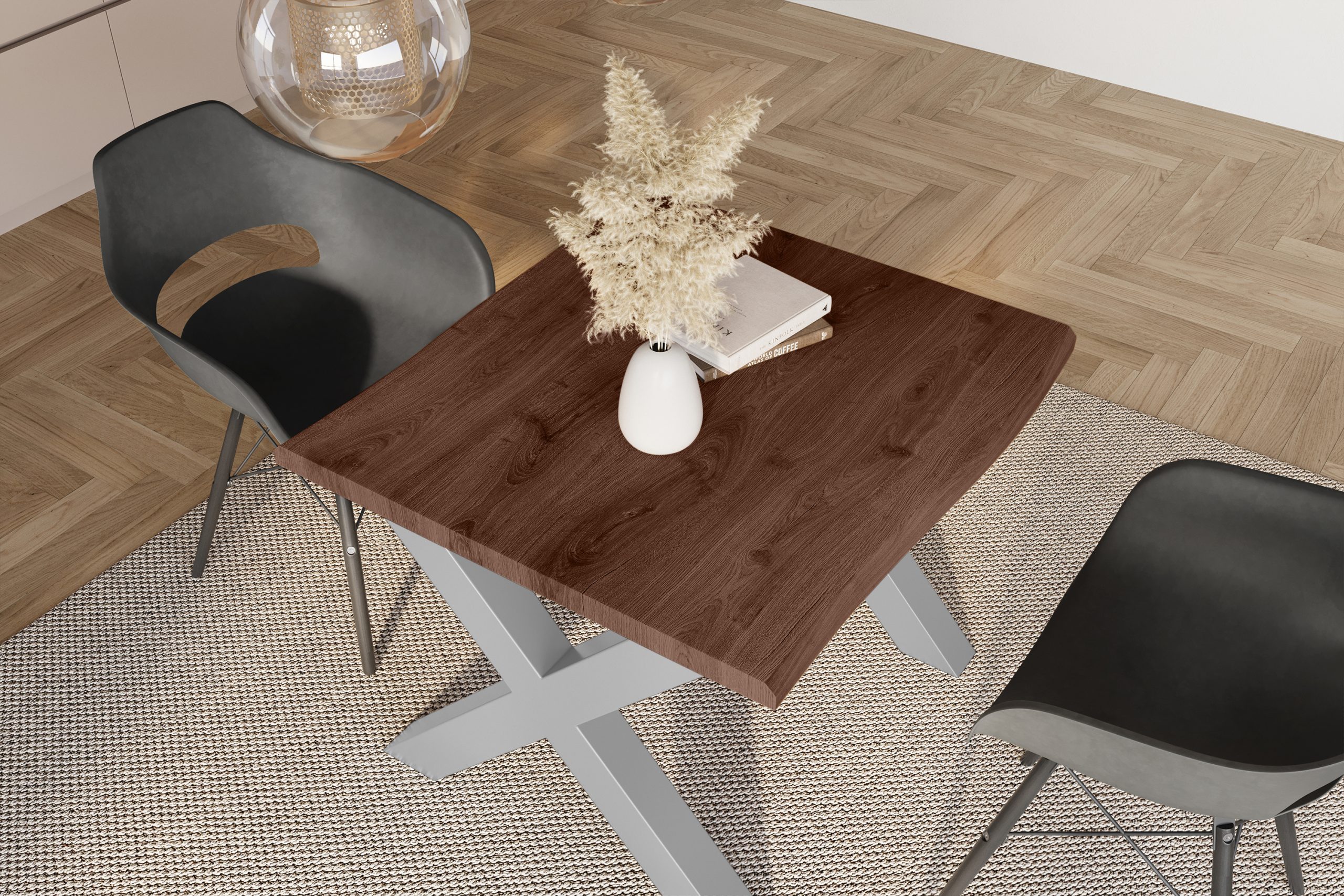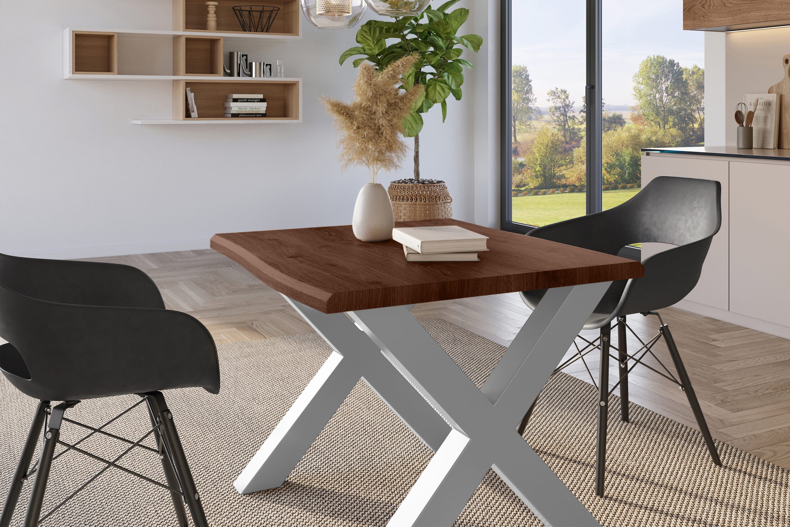 Das X-Gestell aus Metall ist nicht nur optisch ein Hingucker, sondern auch praktisch: Es steht sicher, trägt zuverlässig und kann flexibel montiert werden. Wählen Sie zwischen zwei Montageoptionen für den Fußabstand und passe den Tisch Deinen Stühlen an – perfekt für Küche, Esszimmer oder das Homeoffice.