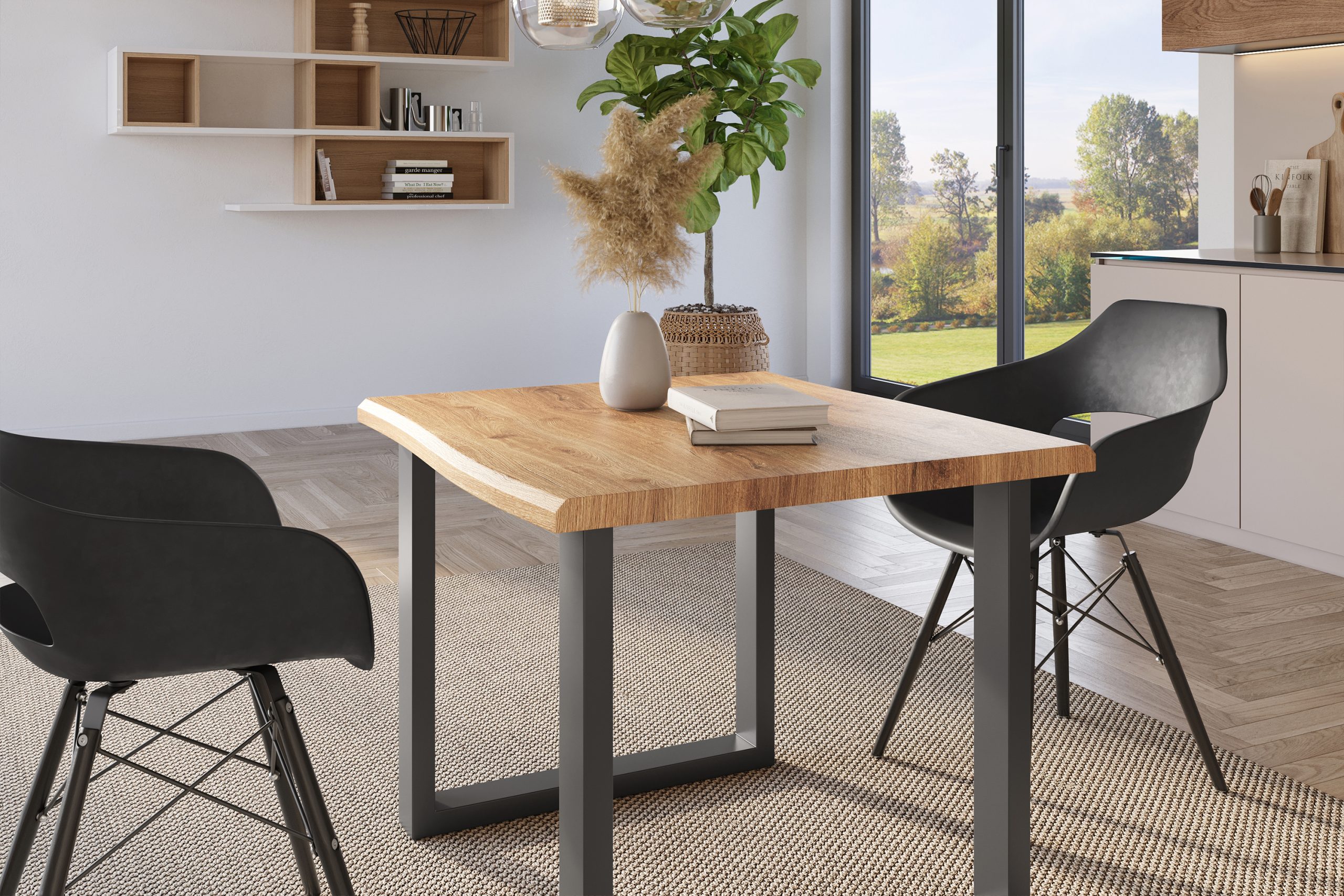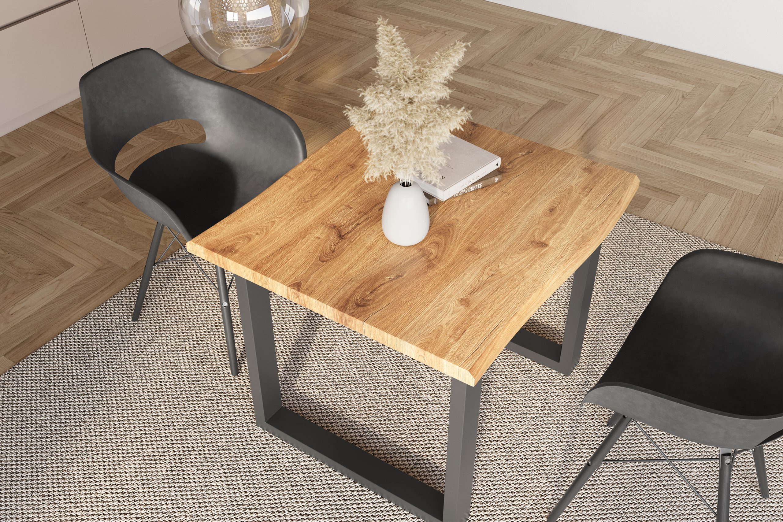 Esstisch Julius | 80 x 80 cm | Holz Wildeiche-Optik | U-Gestell Schwarz | 40 mm Tischplatte mit Baumkante