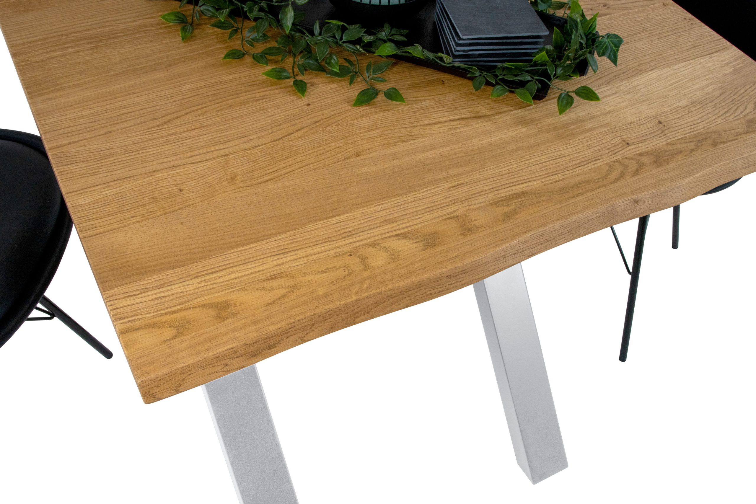 Esstisch Salvador | 90 x 90 cm | Eichenholz massiv geölt | X-Gestell Silber | Baumkante