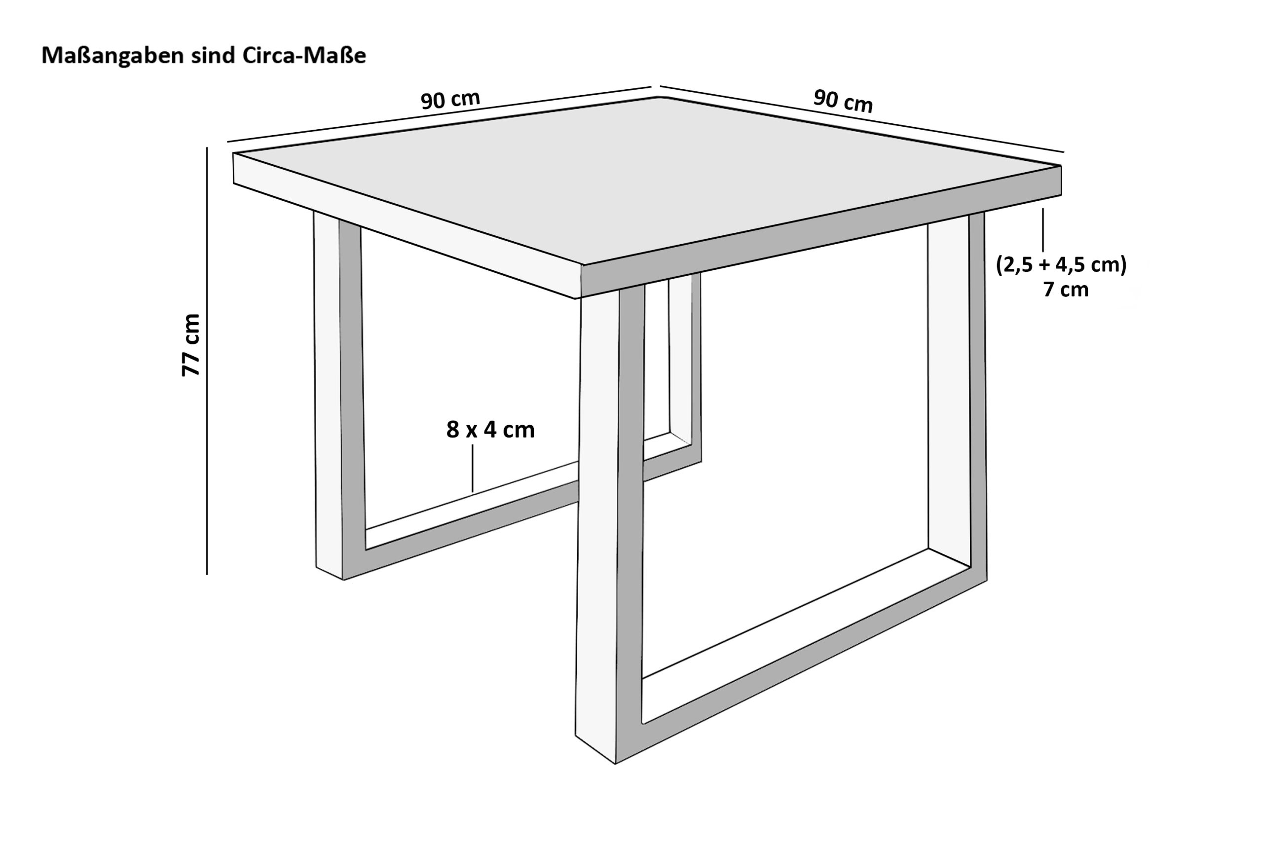 Länge: 90 cm | Breite: ca. 90 cm | Gesamthöhe: ca. 77 cm | Materialstärke: ca. 70 mm (25 + 45 mm)