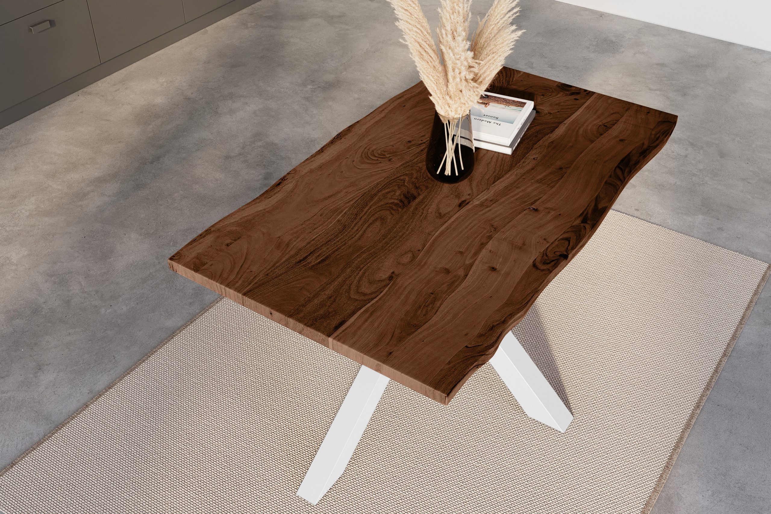Baumkantentisch Kalea | 120 x 80 cm | Akazienholz massiv + nussbaumfarben | Spider-Gestell Weiß | Echte Baumkante