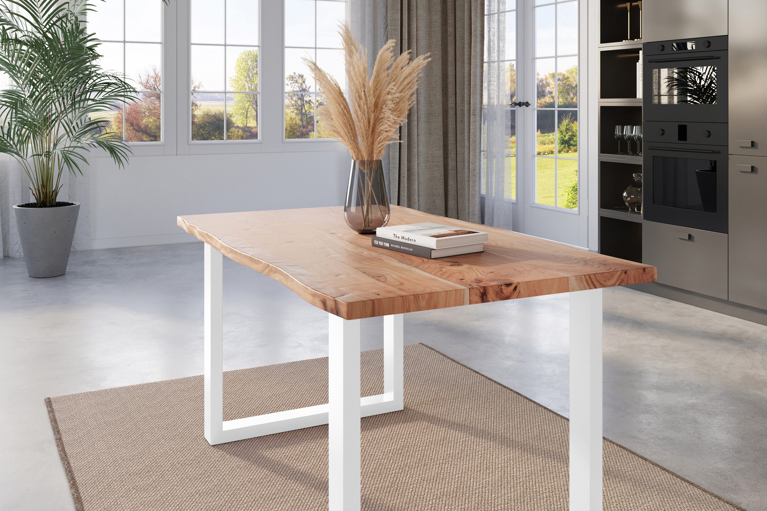 Esstisch Baumkante 140 x 80 cm Akazie natur massiv U-Gestell weiß NICK