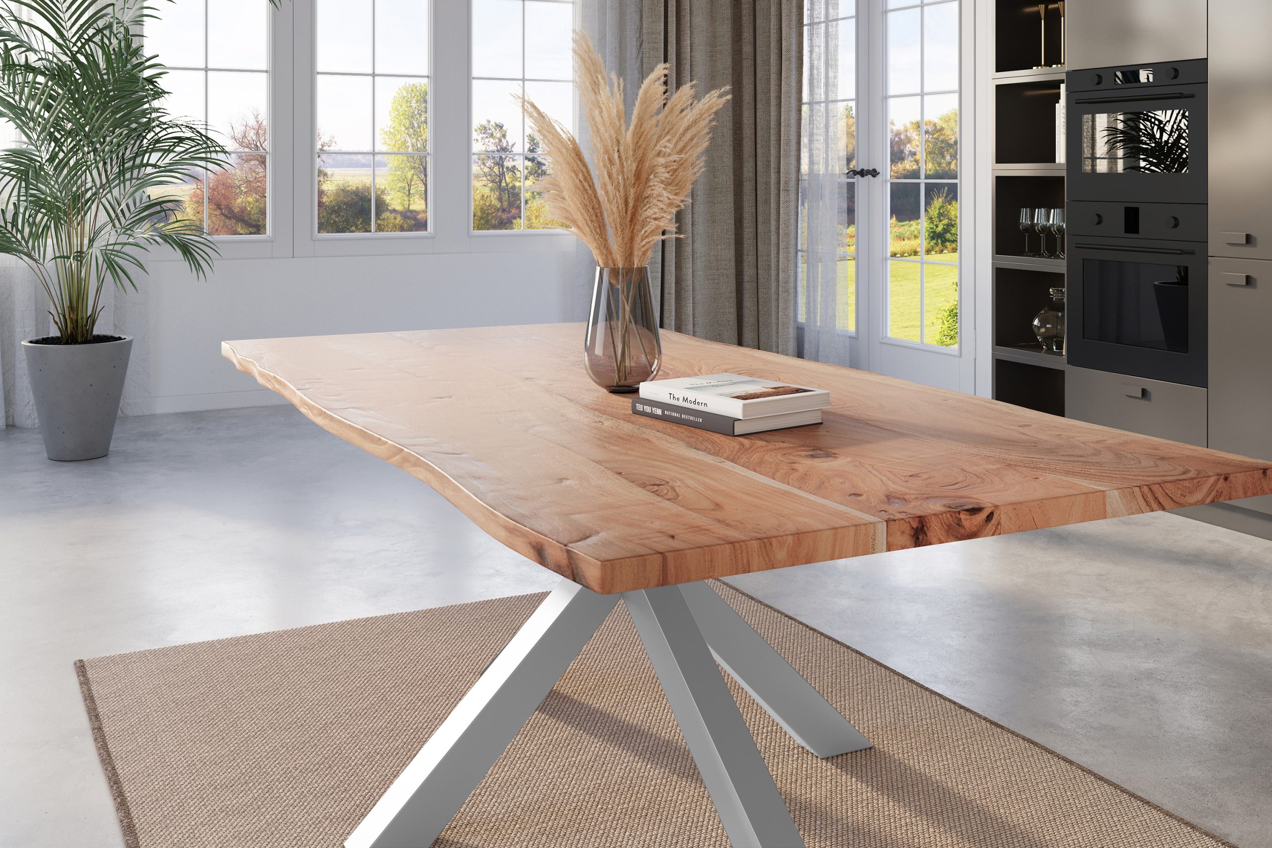 Baumkantentisch Kalea | 180 x 90 cm | Akazienholz massiv + naturfarben | Spider-Gestell Silber | Echte Baumkante