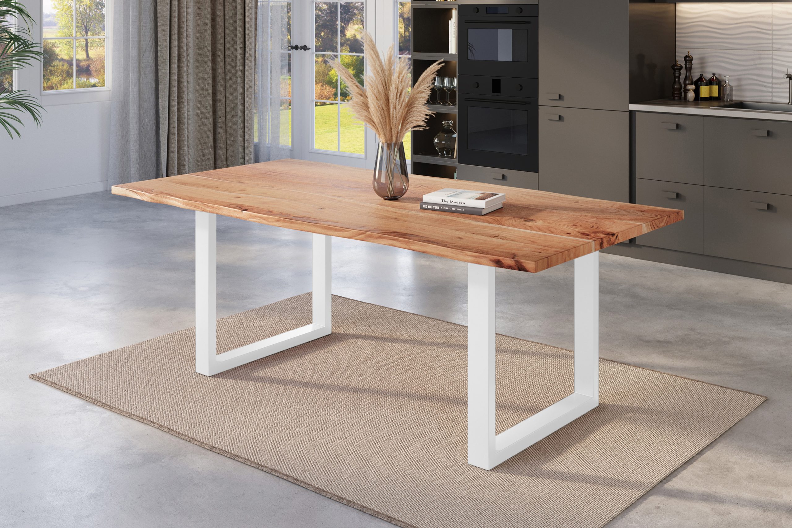 Baumkantentisch Nick | 180 x 90 cm | Akazienholz massiv + naturfarben | U-Gestell Weiß | Echte Baumkante