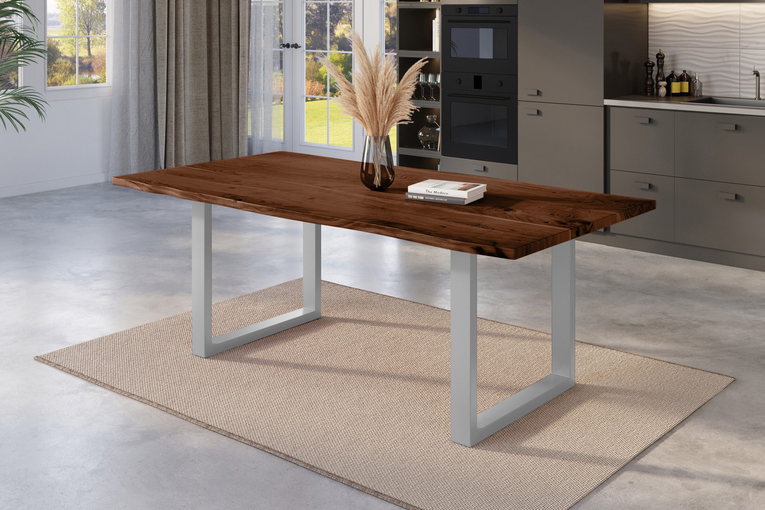 Baumkantentisch Nick | 180 x 90 cm | Akazienholz massiv + nussbaumfarben | U-Gestell Silber | Echte Baumkante