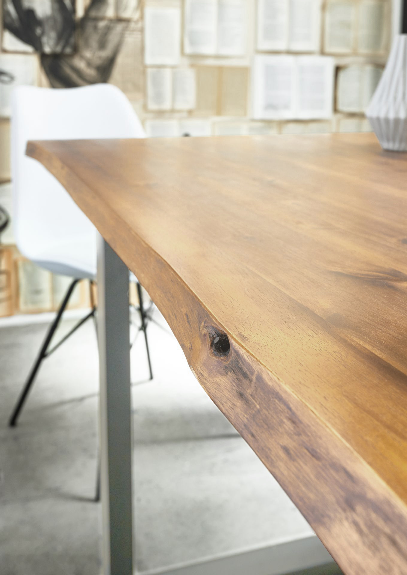 Baumkantentisch Harley | 200 x 100 cm | Akazienholz massiv + Natur lackiert | U-Gestell Silber | Echte Baumkante