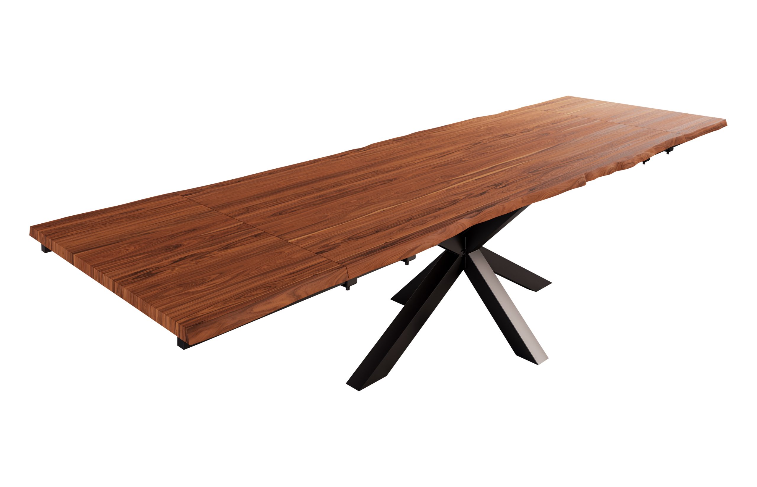 Esstisch Baumkante 200(300)x100 cm mit Ansteckplatten Akazie nougat massiv Spider-Gestell schwarz JANOSH