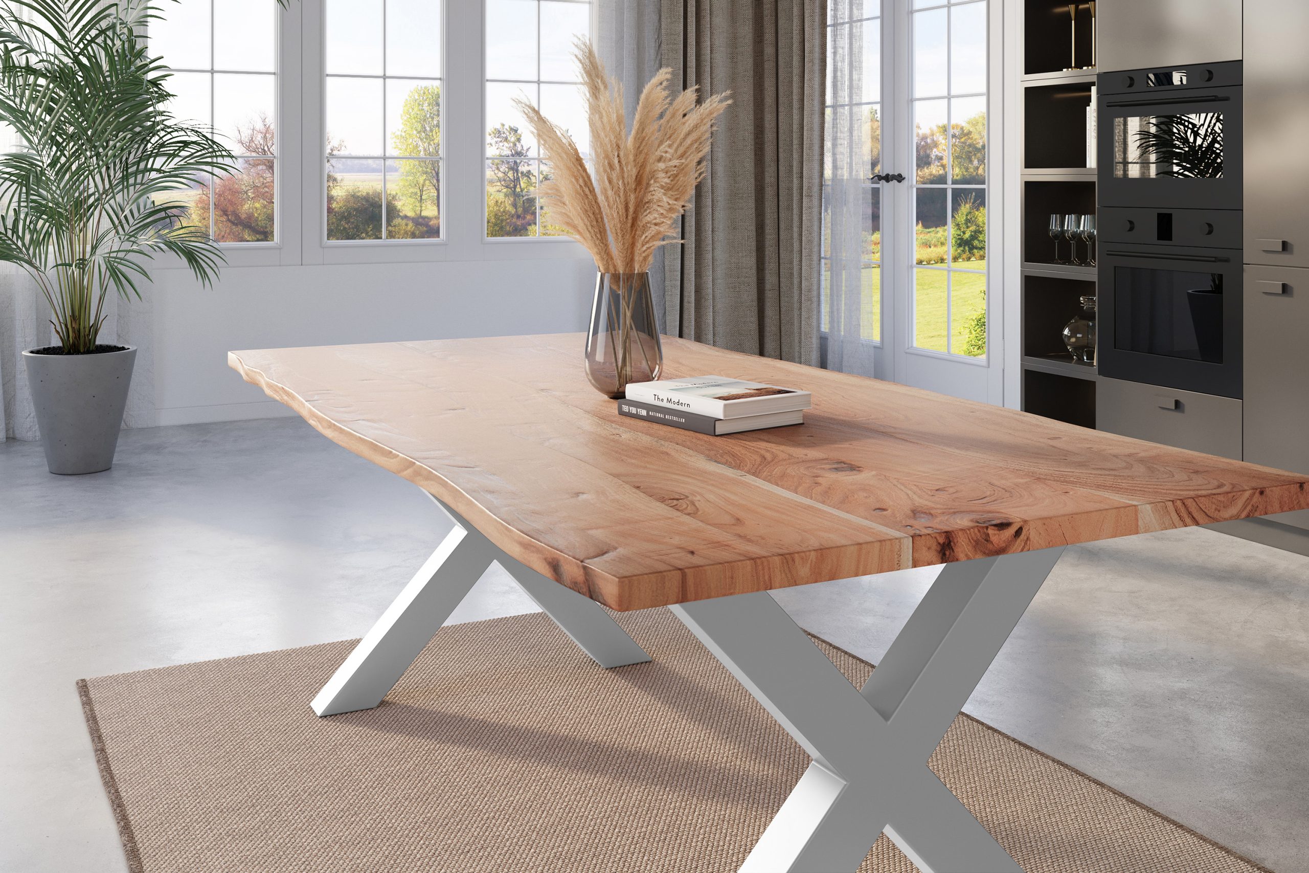 Baumkantentisch Nick | 220 x 100 cm | Akazienholz massiv + naturfarben | X-Gestell Silber | Echte Baumkante