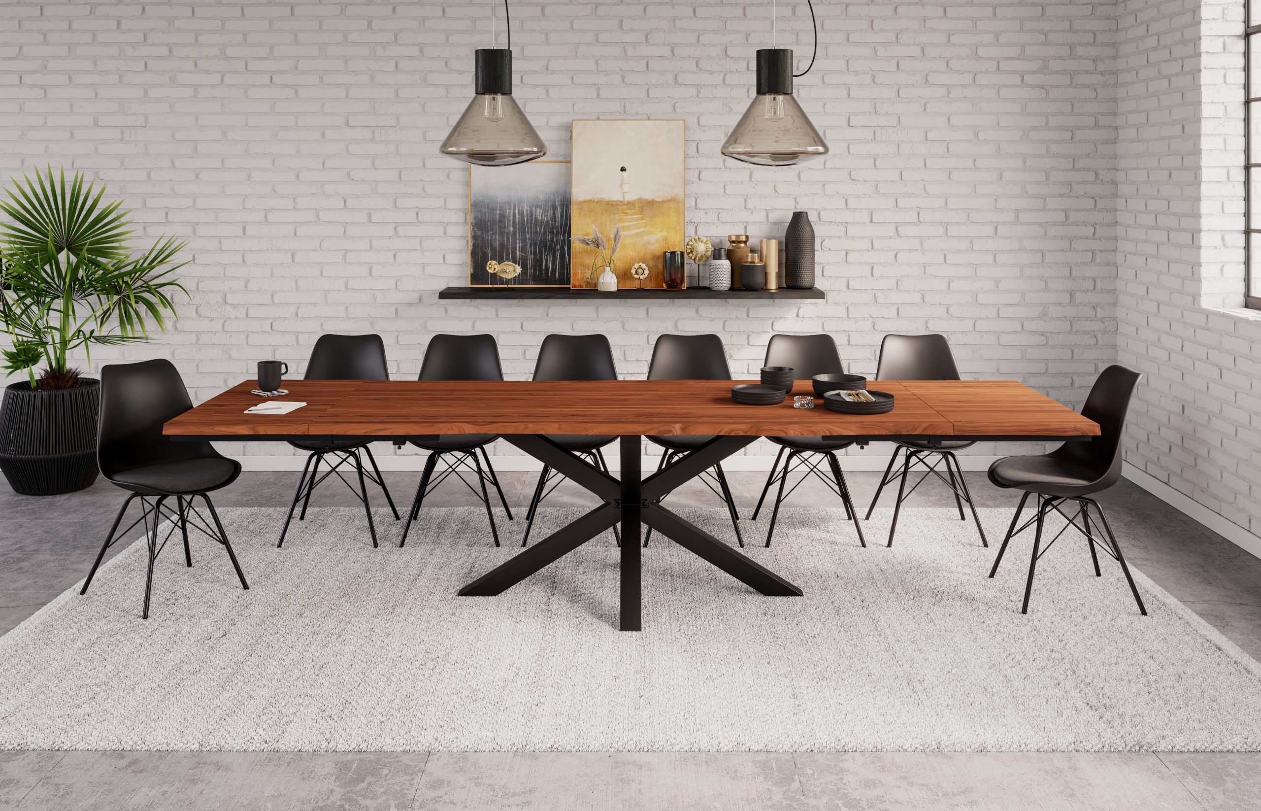 Baumkantentisch Janosh | 220 (320) x 100 cm | Akazienholz massiv nougatfarben | Spider-Gestell Schwarz | Mit Ansteckplatten | Echte Baumkante
