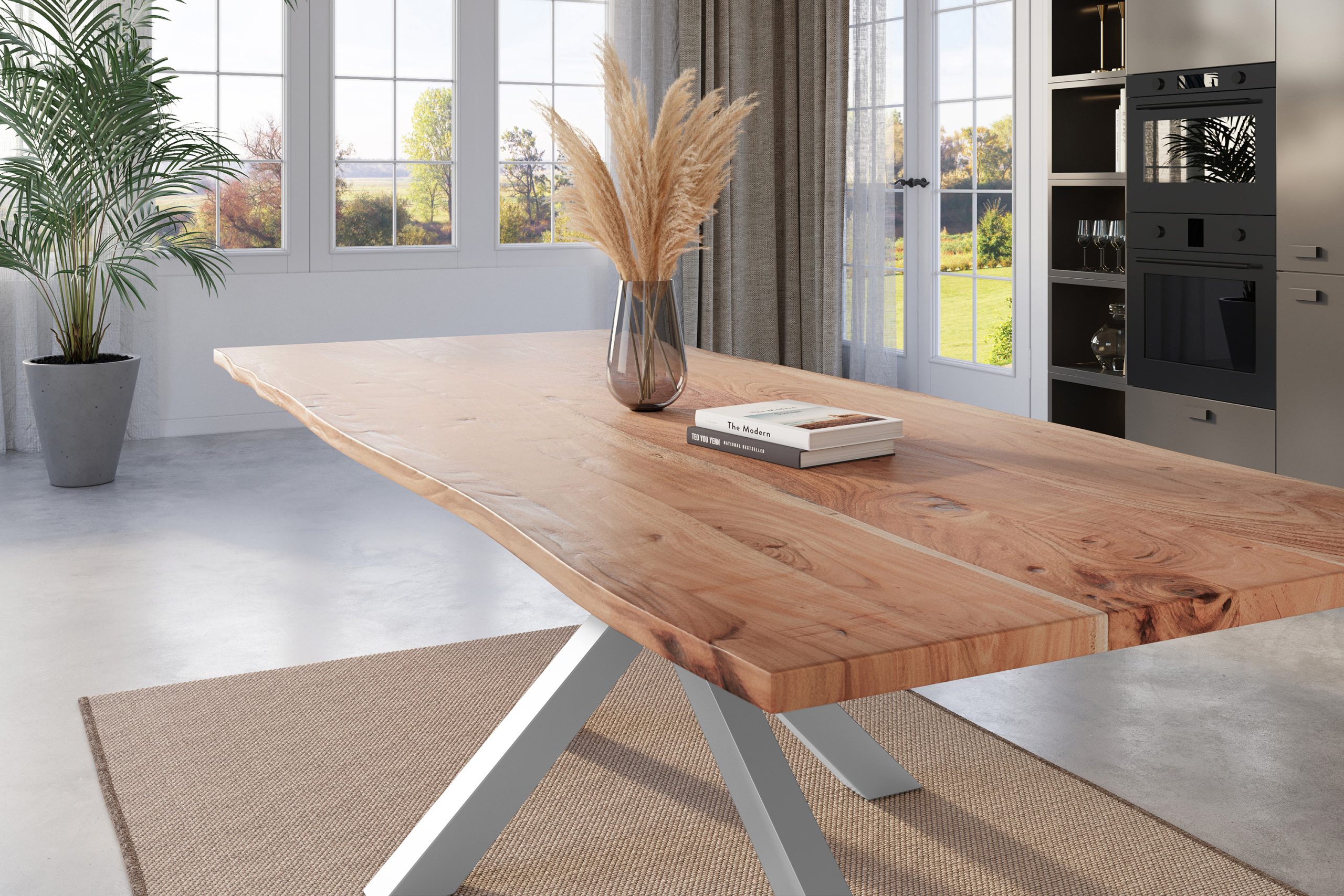 Baumkantentisch Kalea | 240 x 100 cm | Akazienholz massiv + naturfarben | Spider-Gestell Silber | Echte Baumkante