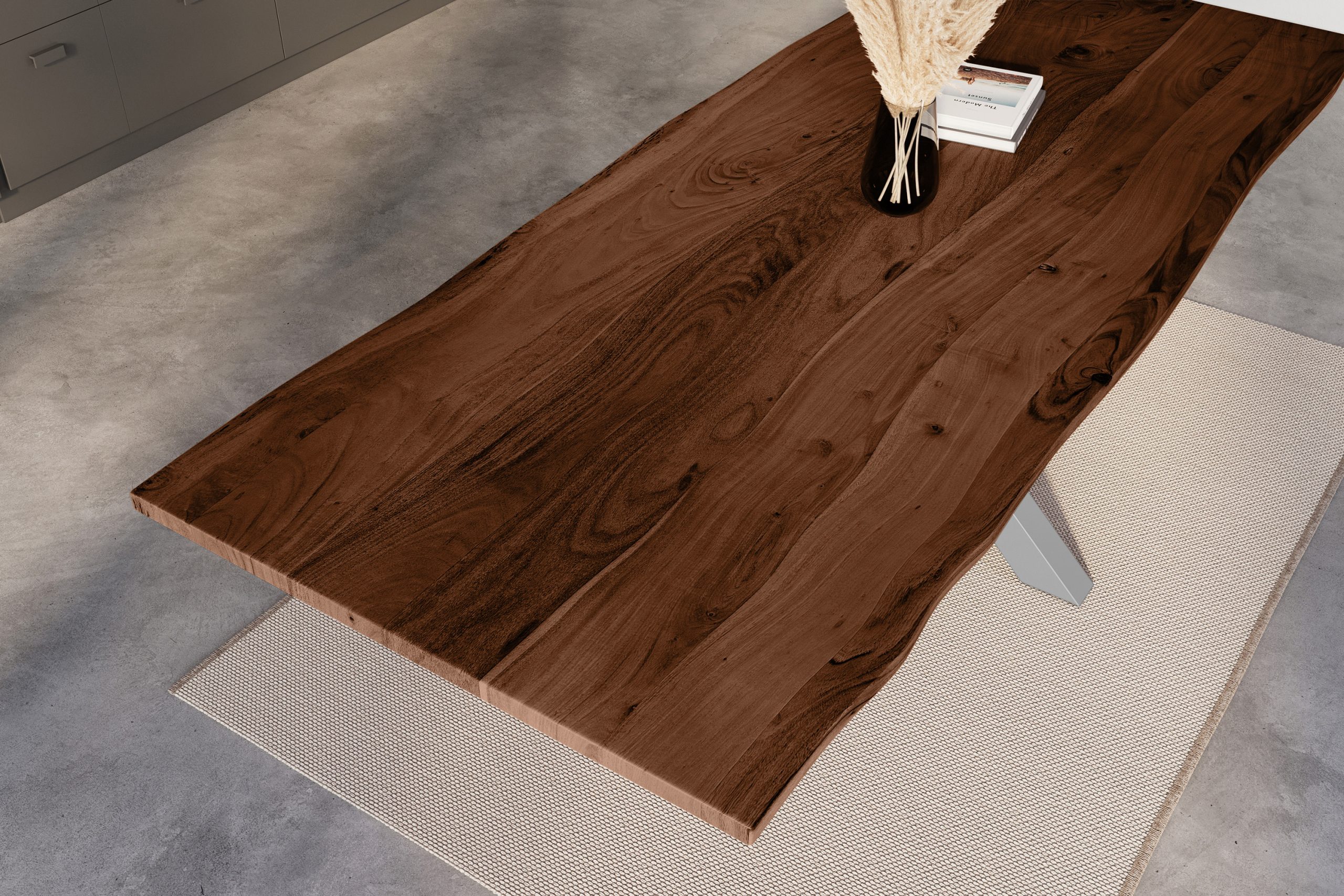 Baumkantentisch Kalea | 260 x 100 cm | Akazienholz massiv + nussbaumfarben | Spider-Gestell Silber | Echte Baumkante