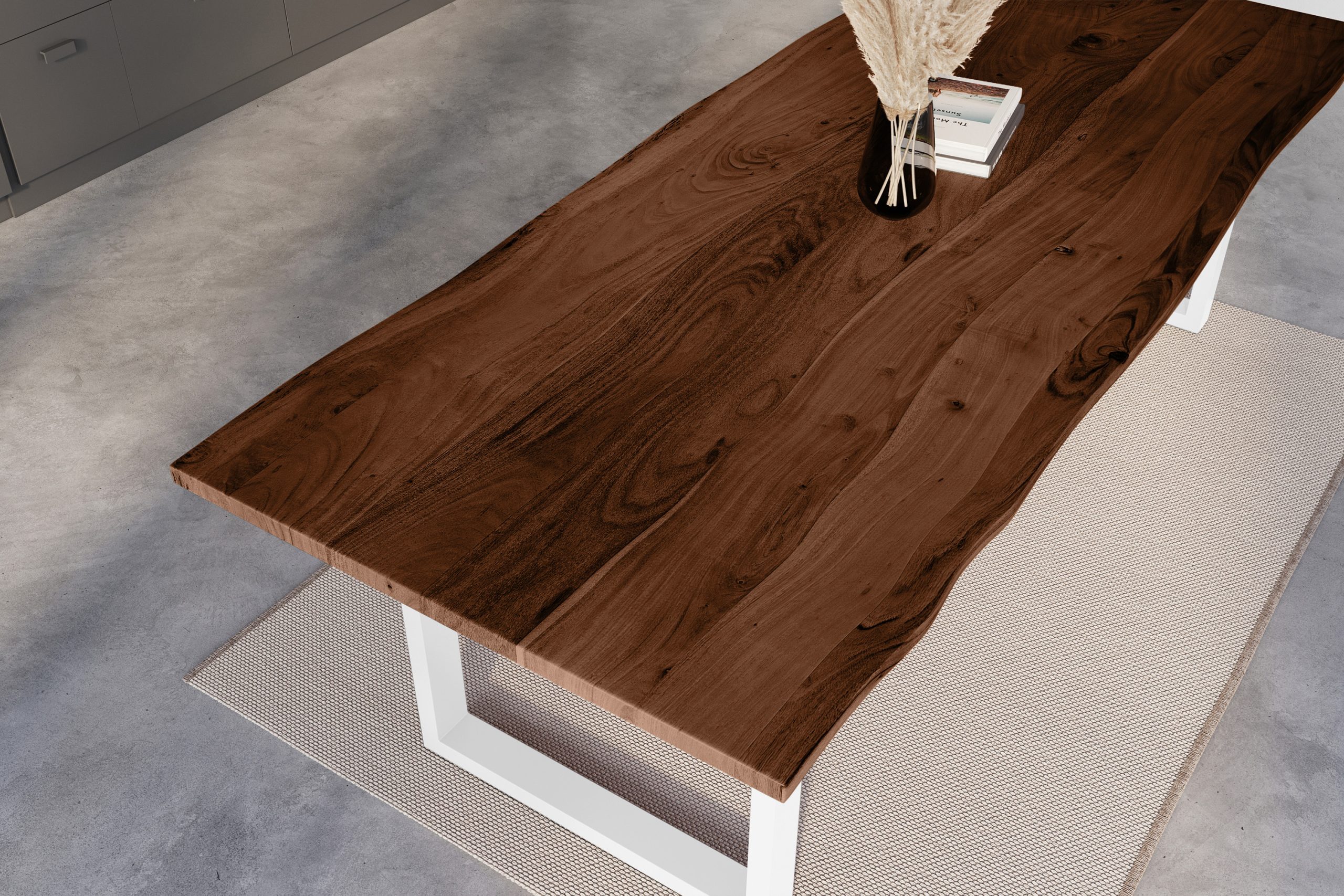 Baumkantentisch Nick | 260 x 100 cm | Akazienholz massiv + nussbaumfarben | U-Gestell Weiß | Echte Baumkante