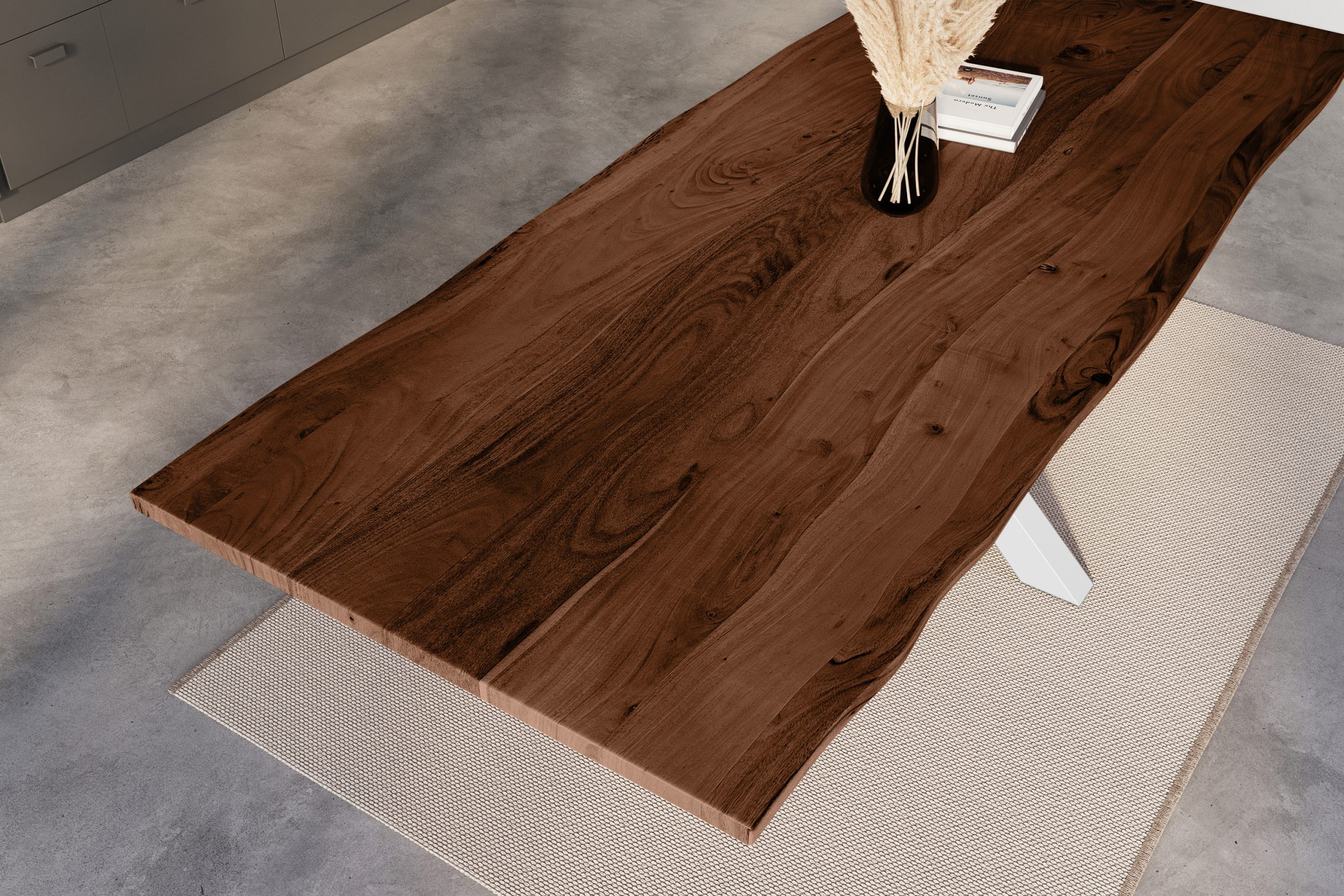 Esstisch Baumkante 300 x 100 cm Akazie nussbaum massiv Spider-Gestell weiß KALEA