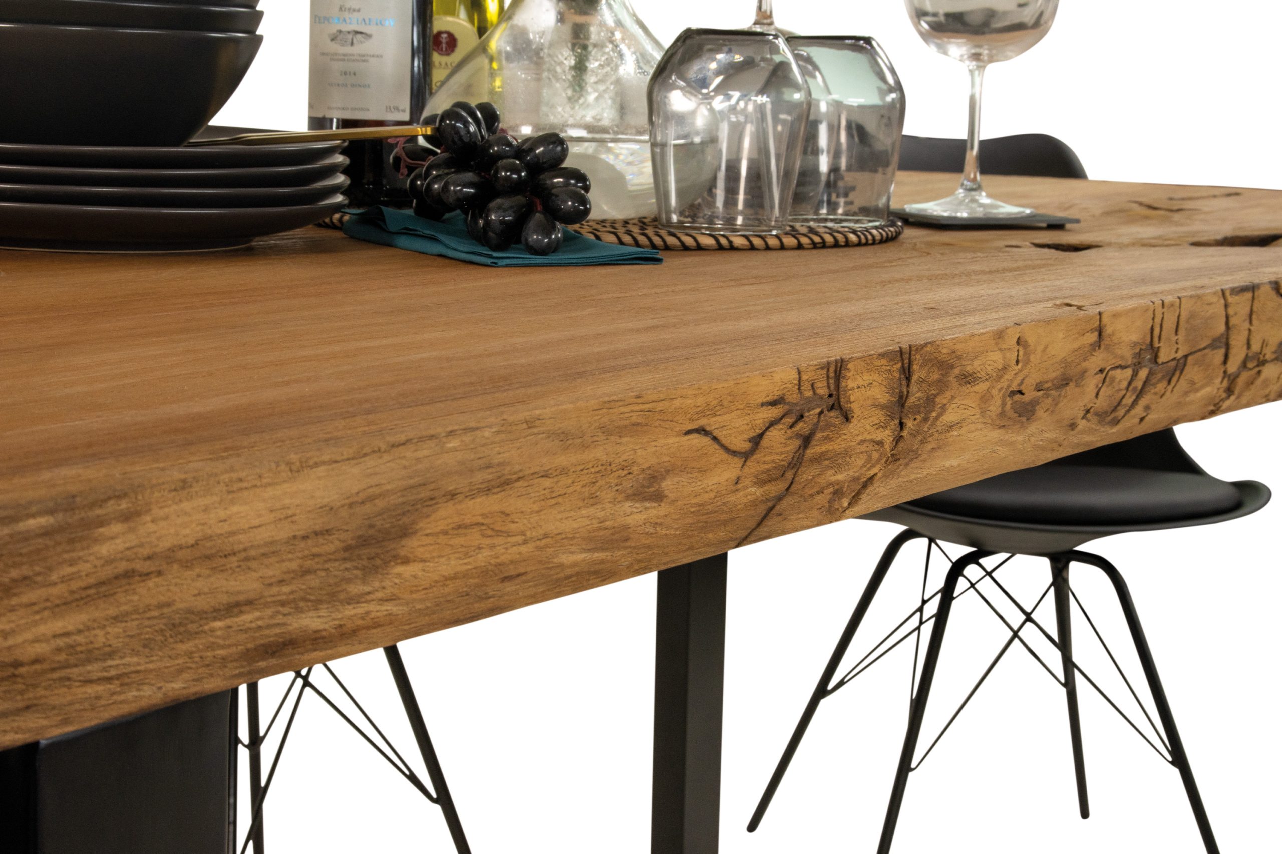 Der Tisch ist mit mehreren Bohrlöchern ausgestattet, die eine flexible Montage der Tischbeine ermöglichen. Dadurch können Sie das Gestell so anpassen, dass Ihre Stühle bequem unter den Tisch passen. Das schwarz lackierte U-Gestell sorgt für einen modernen Kontrast zur natürlichen Holzstruktur. Die stabile Metallkonstruktion trägt das massive Gewicht mühelos und verleiht dem Tisch einen urbanen Industrial-Touch.