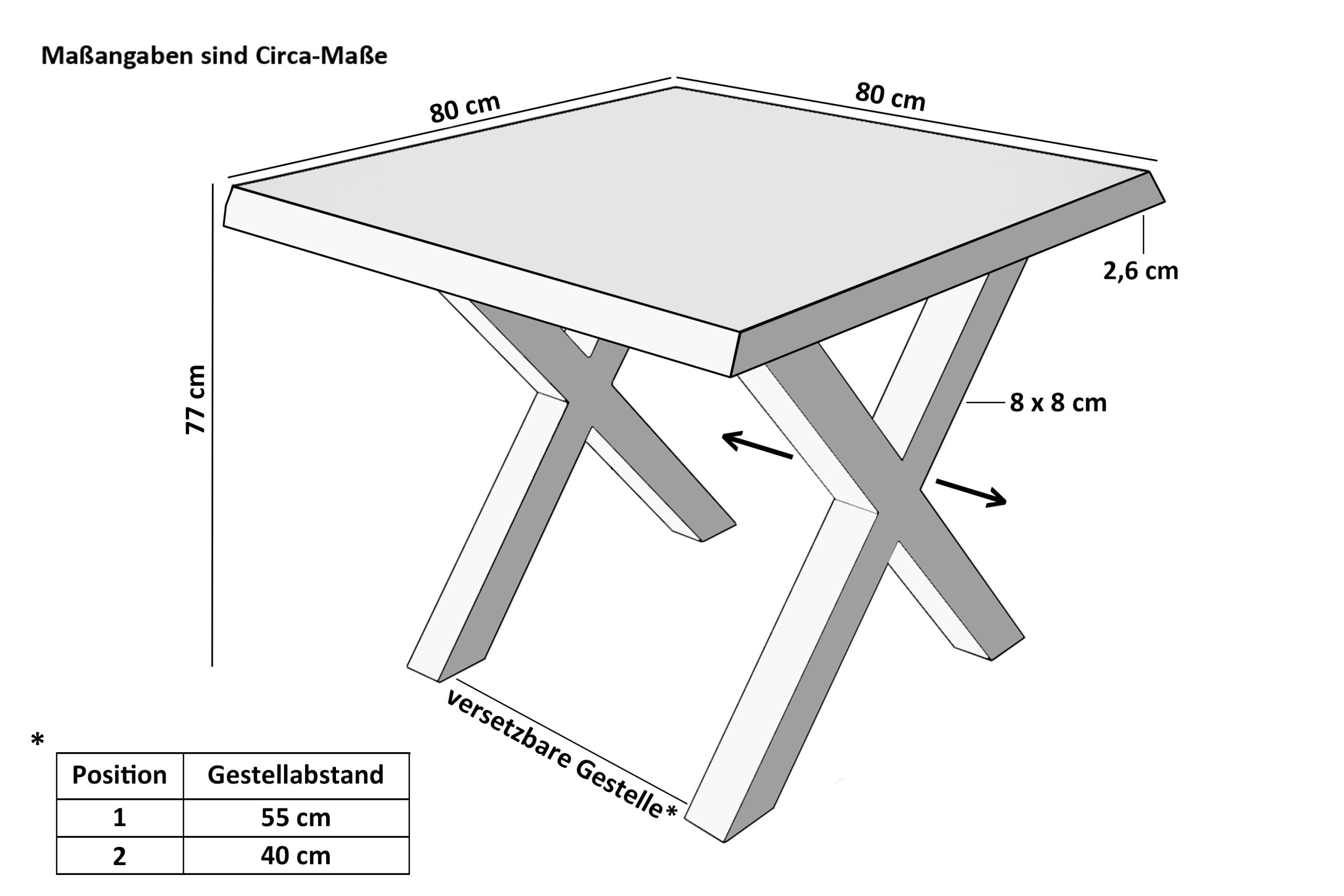 Länge: 80 cm | Breite: ca. 80 cm | Gesamthöhe: ca. 77 cm | Tischplatte: ca. 2,6 cm