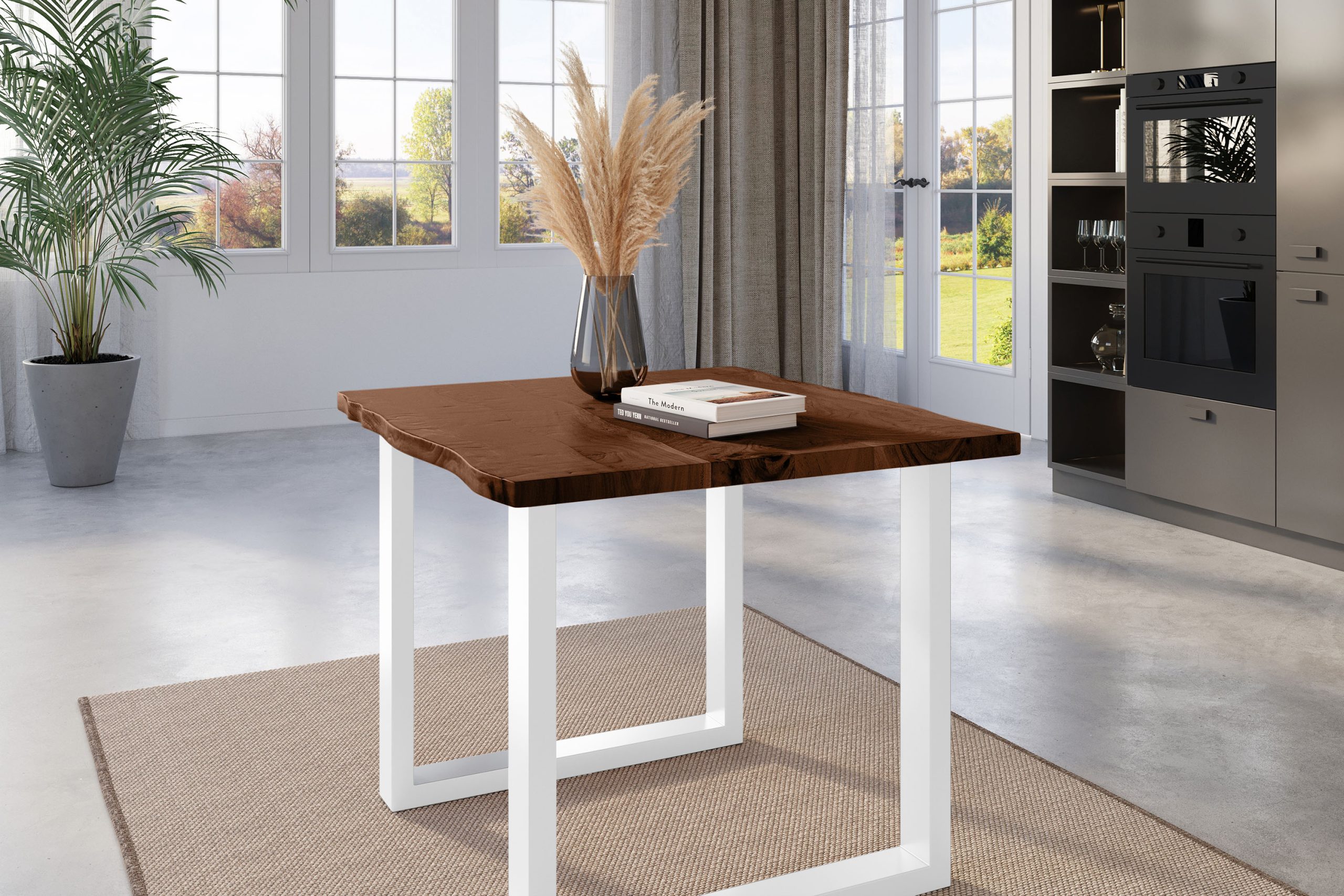 Baumkantentisch Nick | 80 x 80 cm | Akazienholz massiv + nussbaumfarben | U-Gestell Weiß | Echte Baumkante