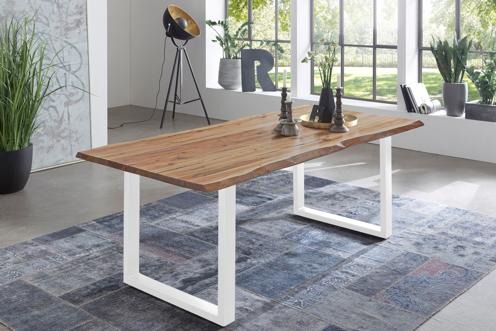 Baumkantentisch Noah | 140 x 80 cm | Akazienholz massiv eichenfarben | U-Gestell Weiß | Echte Baumkante