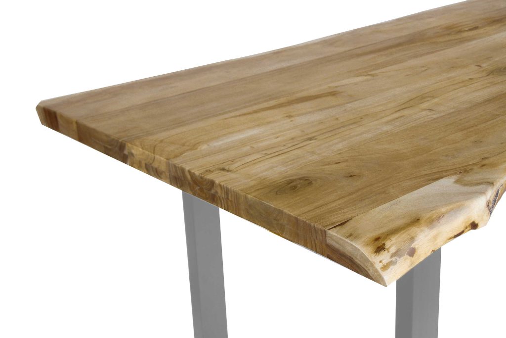 Die aufgedoppelte Tischkante (50 mm Gesamtstärke) verleiht dem Tisch nicht nur eine kraftvolle Optik, sondern sorgt auch für zusätzliche Stabilität. Das silberne U-Gestell aus Metall steht im spannenden Kontrast zur natürlichen Tischplatte – eine gelungene Verbindung aus Natur und urbanem Industrial-Look.