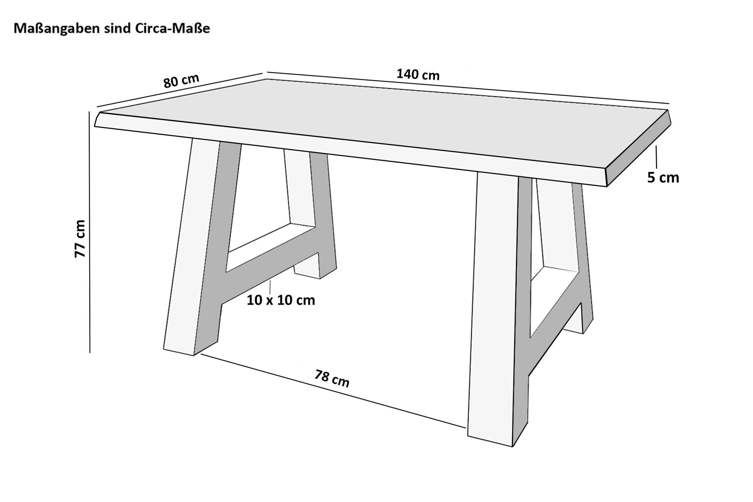 Länge: 140 cm | Breite: ca. 80 cm | Gesamthöhe: ca. 77 cm | Tischplattenstärke: ca. 50 mm (25 + 25 mm)