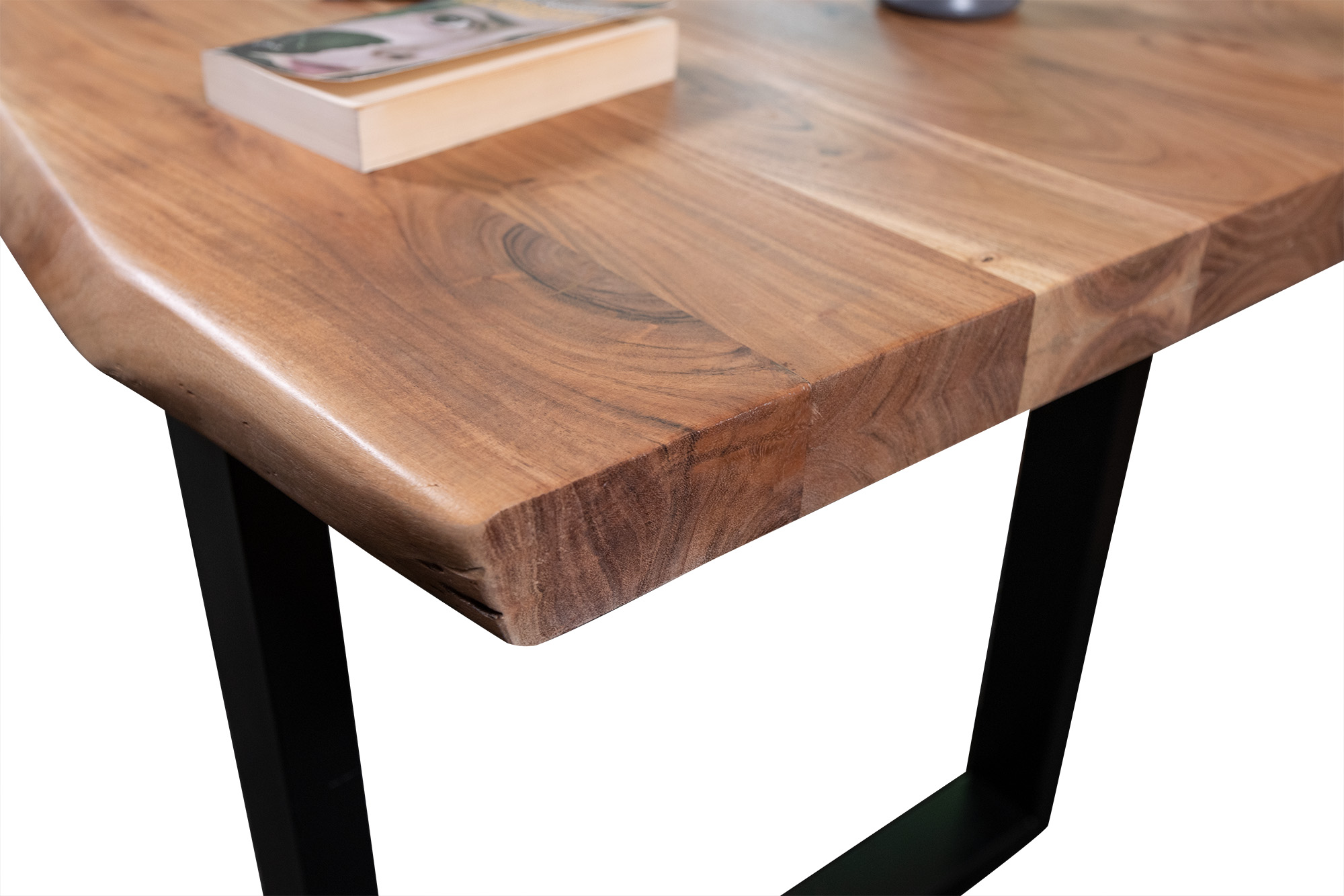 Die aufgedoppelte Tischkante (50 mm Gesamtstärke) verleiht dem Tisch nicht nur eine kraftvolle Optik, sondern sorgt auch für zusätzliche Stabilität. Das schwarze U-Gestell aus Metall steht im spannenden Kontrast zur natürlichen Tischplatte – eine gelungene Verbindung aus Natur und urbanem Industrial-Look.