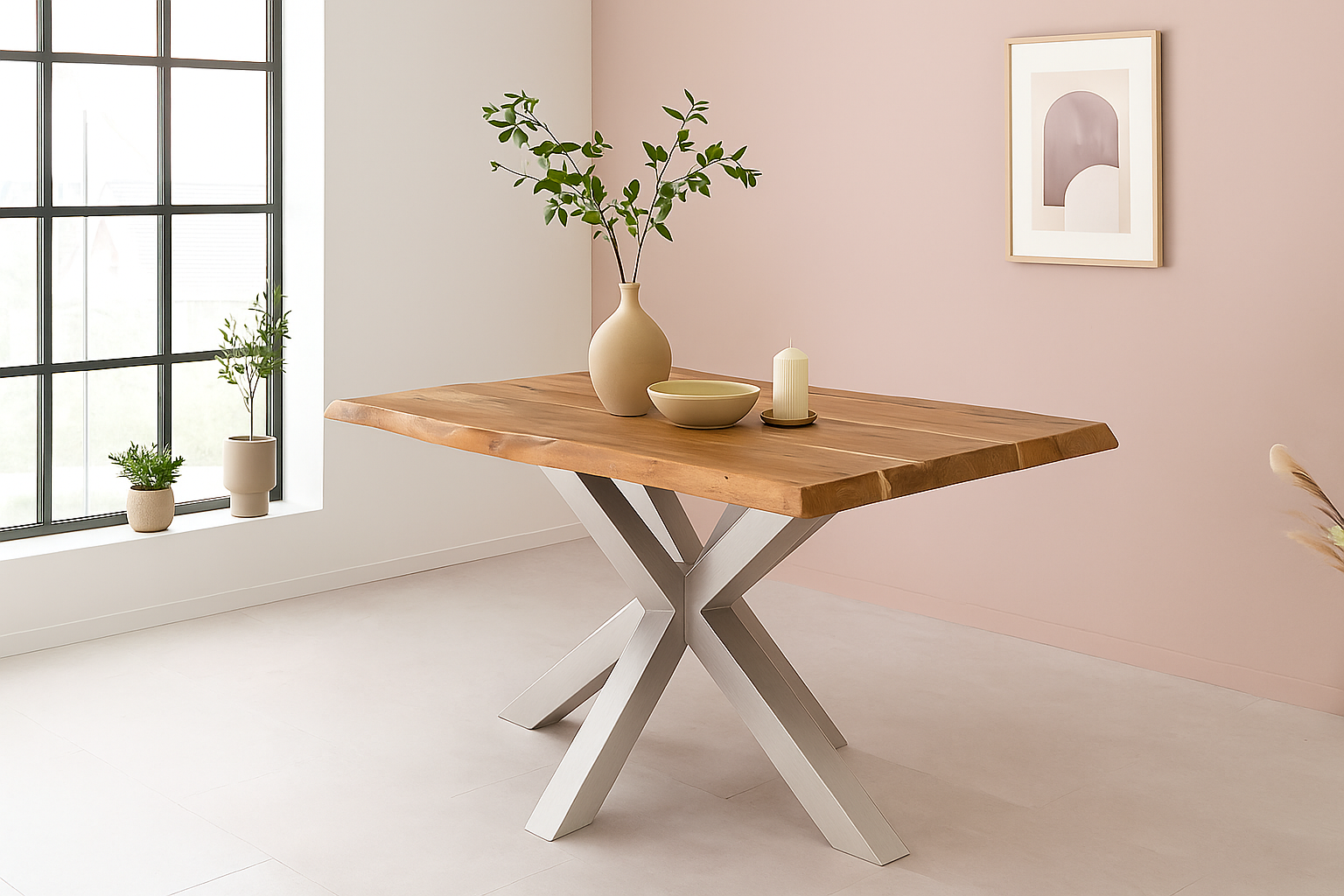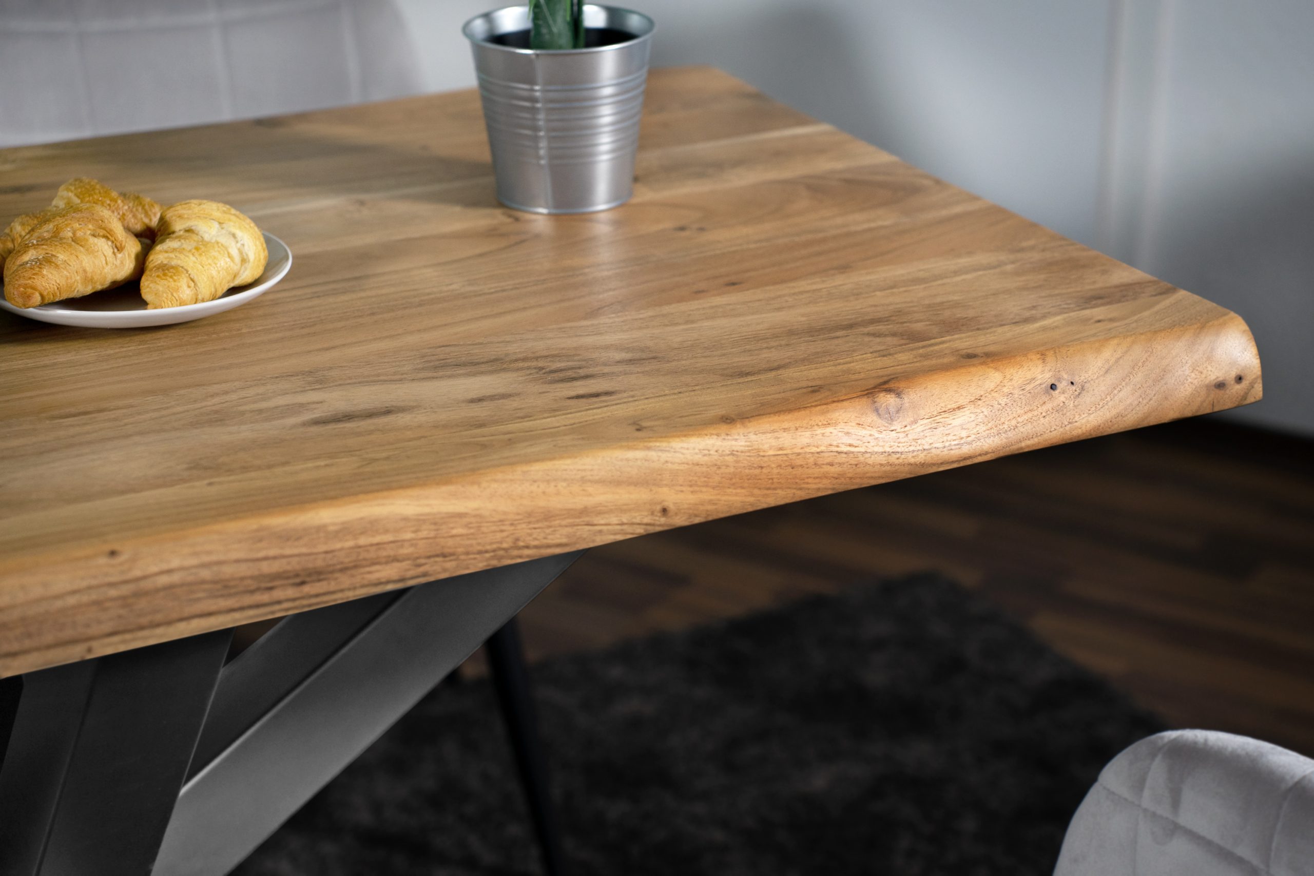 Die aufgedoppelte Tischkante (50 mm Gesamtstärke) verleiht dem Tisch nicht nur eine kraftvolle Optik, sondern sorgt auch für zusätzliche Stabilität. Das silberne Spider-Gestell aus Metall steht im spannenden Kontrast zur natürlichen Tischplatte – eine gelungene Verbindung aus Natur und urbanem Industrial-Look.