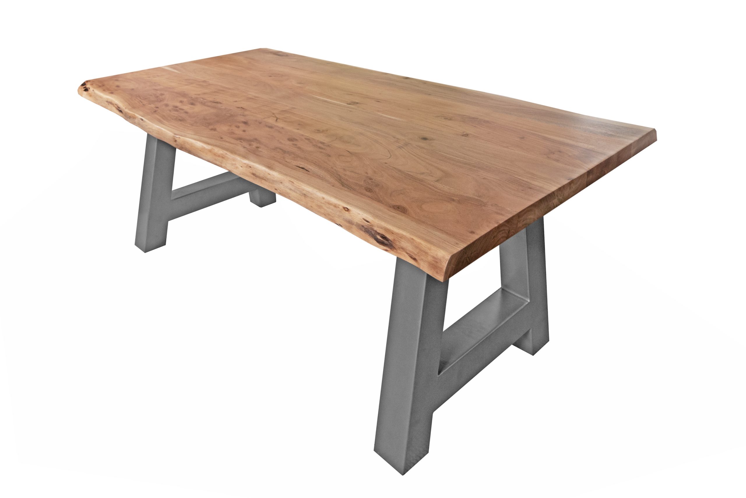 Die aufgedoppelte Tischkante (50 mm Gesamtstärke) verleiht dem Tisch nicht nur eine kraftvolle Optik, sondern sorgt auch für zusätzliche Stabilität. Das silberne A-Gestell aus Metall steht im spannenden Kontrast zur natürlichen Tischplatte – eine gelungene Verbindung aus Natur und urbanem Industrial-Look.