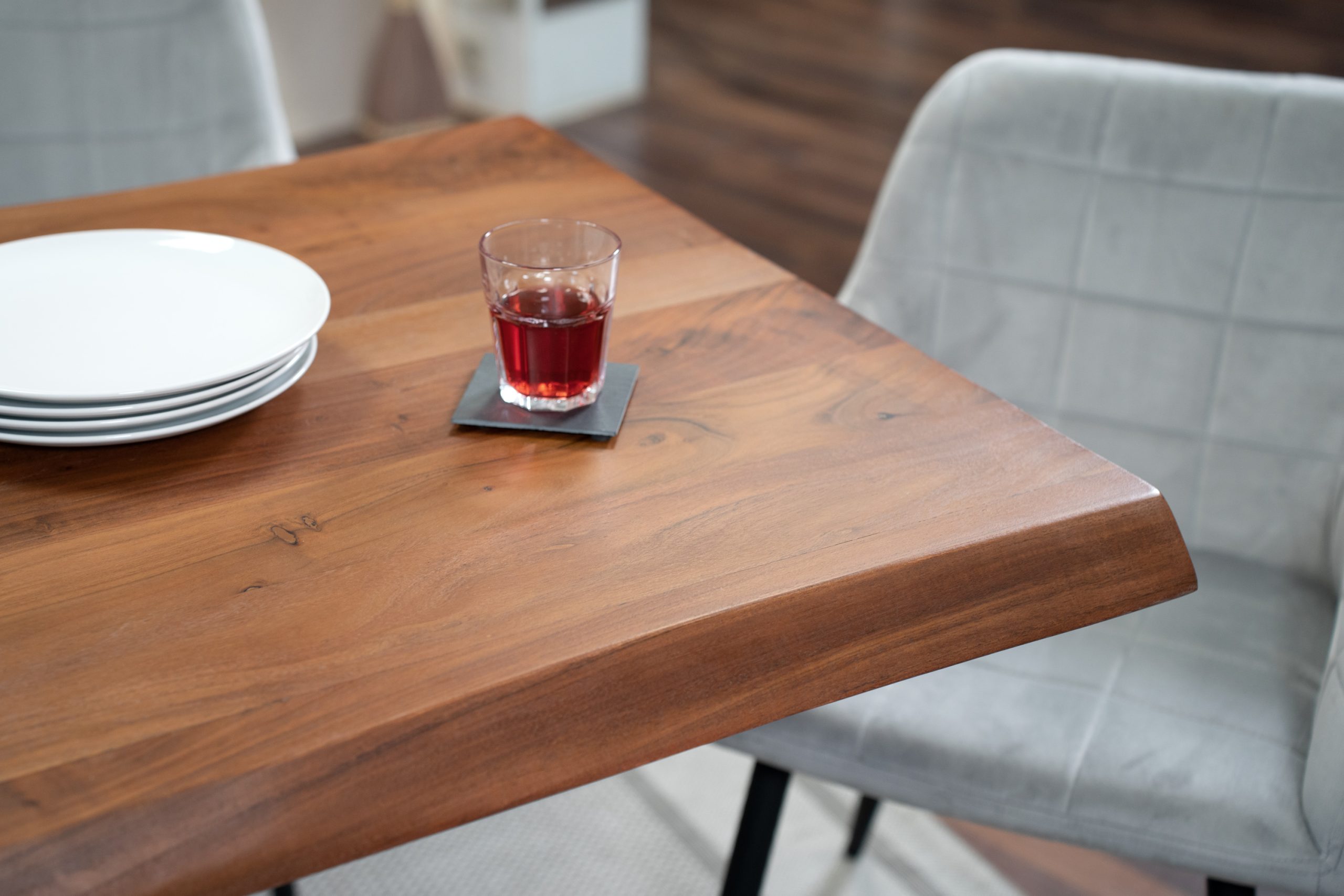 Baumkantentisch Cali | 140 x 80 cm | Akazienholz massiv nussbaumfarben | Spider-Gestell Schwarz | Echte Baumkante