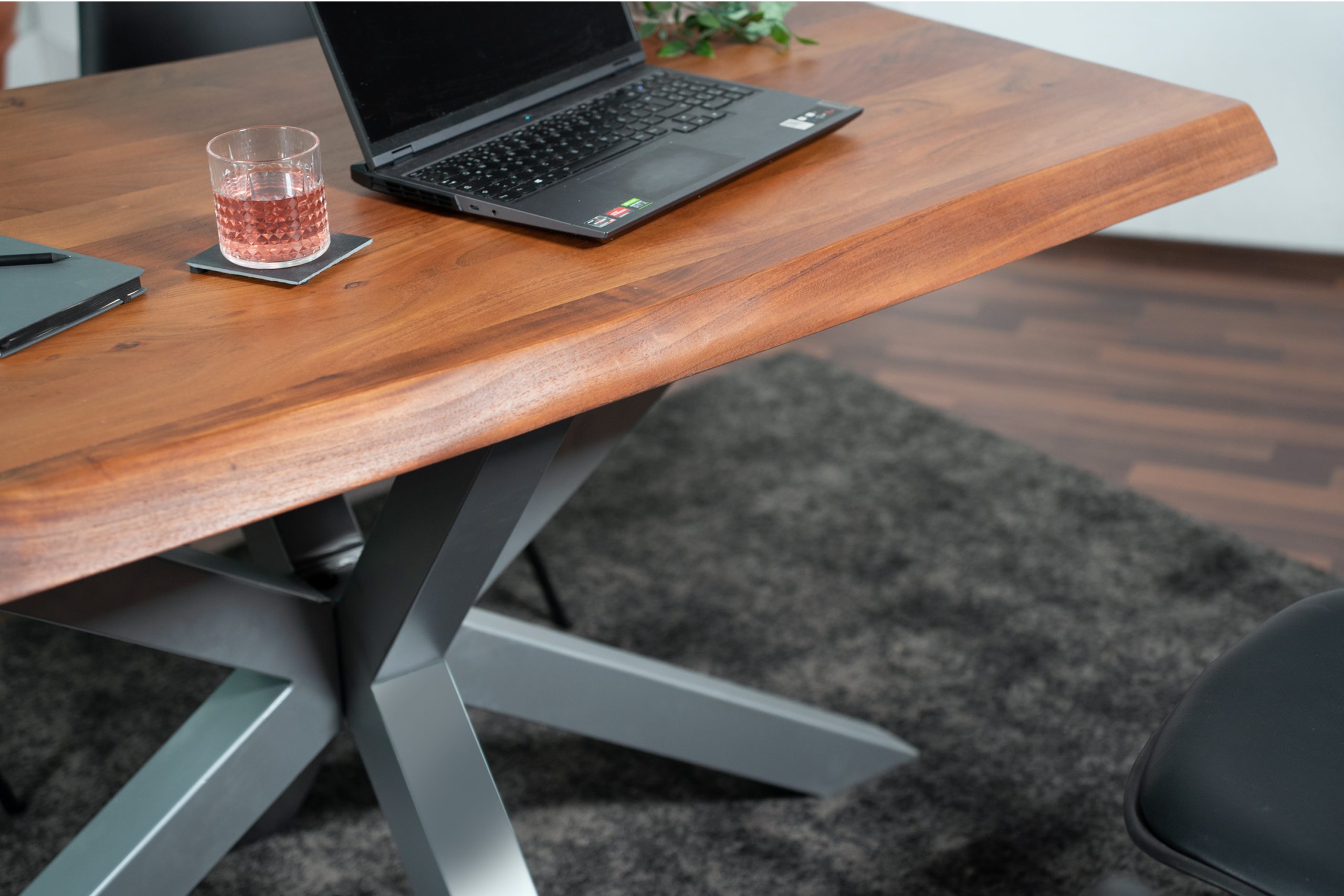 Baumkantentisch Cali | 160 x 85 cm | Akazienholz massiv nussbaumfarben | Spider-Gestell Silber | Echte Baumkante