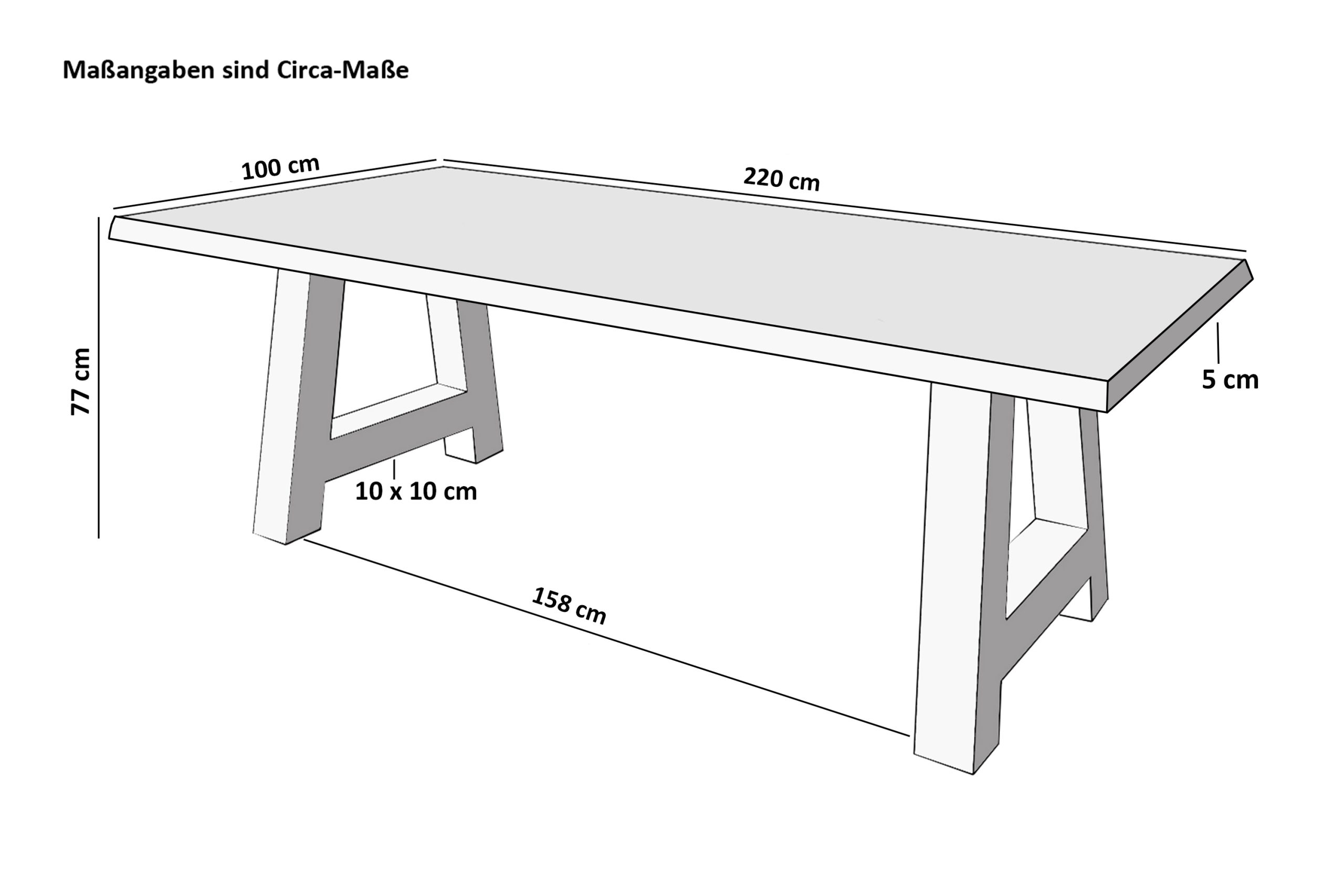 Länge: 220 cm | Breite: ca. 100 cm | Gesamthöhe: ca. 77 cm | Tischplattenstärke: ca. 50 mm (25 + 25 mm)
