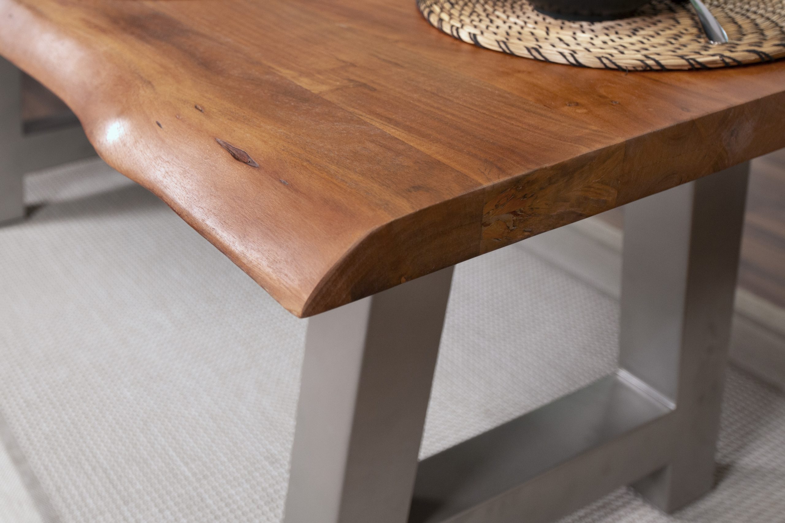 Die aufgedoppelte Tischkante (50 mm Gesamtstärke) verleiht dem Tisch nicht nur eine kraftvolle Optik, sondern sorgt auch für zusätzliche Stabilität. Das silberne A-Gestell aus Metall steht im spannenden Kontrast zur natürlichen Tischplatte – eine gelungene Verbindung aus Natur und urbanem Industrial-Look.