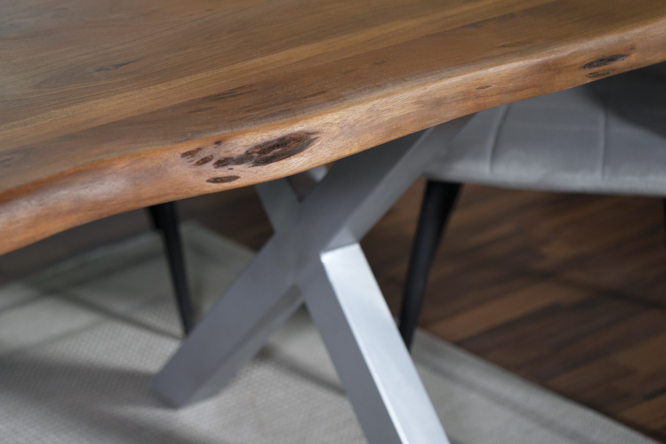 Die aufgedoppelte Tischkante (50 mm Gesamtstärke) verleiht dem Tisch nicht nur eine kraftvolle Optik, sondern sorgt auch für zusätzliche Stabilität. Das silberne X-Gestell aus Metall steht im spannenden Kontrast zur natürlichen Tischplatte – eine gelungene Verbindung aus Natur und urbanem Industrial-Look.