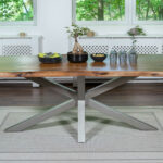 Die aufgedoppelte Tischkante (50 mm Gesamtstärke) verleiht dem Tisch nicht nur eine kraftvolle Optik, sondern sorgt auch für zusätzliche Stabilität. Das silberne Spider-Gestell aus Metall steht im spannenden Kontrast zur natürlichen Tischplatte – eine gelungene Verbindung aus Natur und urbanem Industrial-Look.