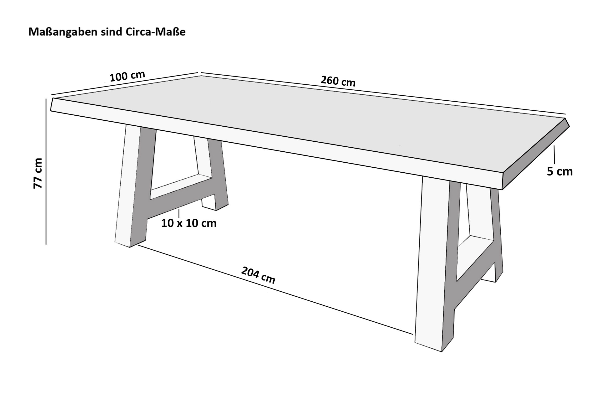 Länge: 260 cm | Breite: ca. 100 cm | Gesamthöhe: ca. 77 cm | Tischplattenstärke: ca. 50 mm (25 + 25 mm)