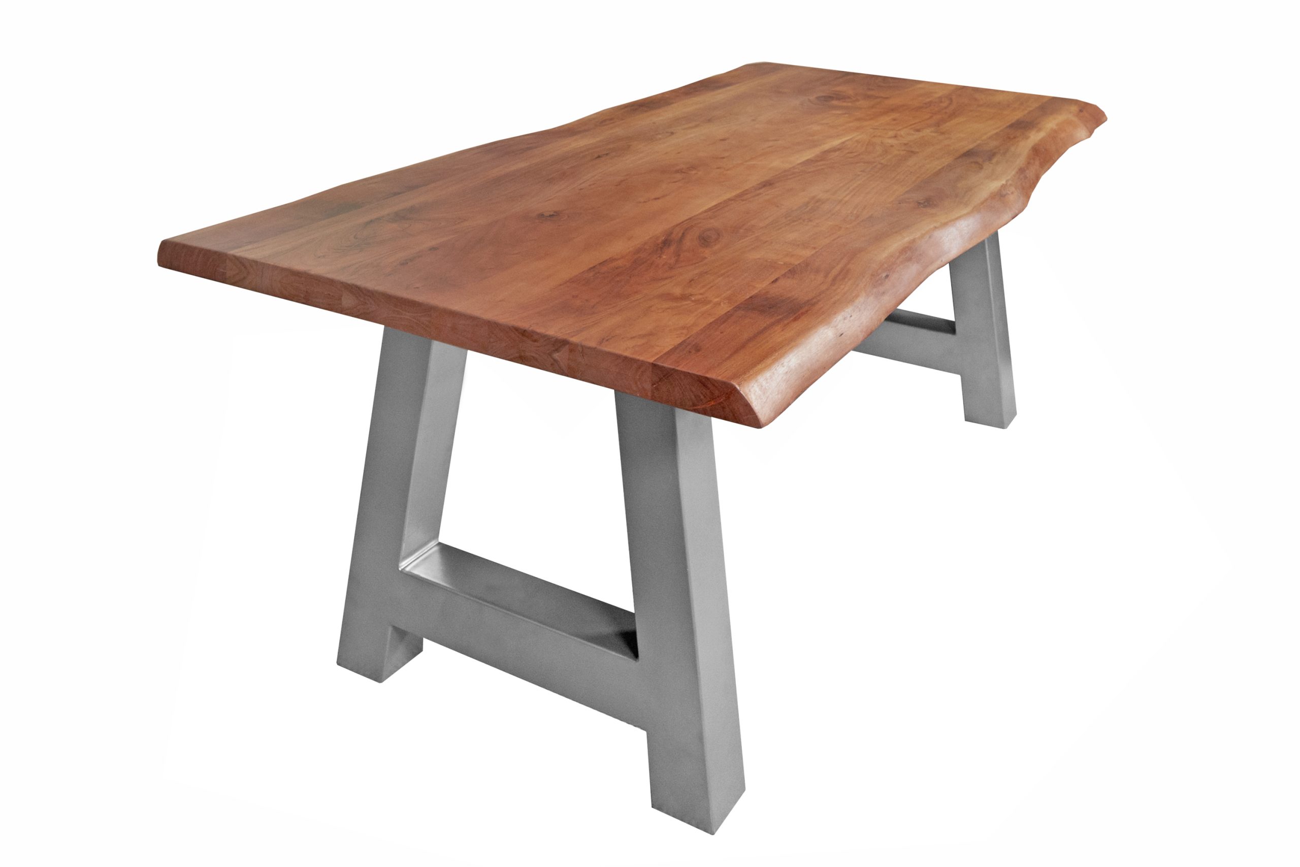Die aufgedoppelte Tischkante (50 mm Gesamtstärke) verleiht dem Tisch nicht nur eine kraftvolle Optik, sondern sorgt auch für zusätzliche Stabilität. Das silberne A-Gestell aus Metall steht im spannenden Kontrast zur natürlichen Tischplatte – eine gelungene Verbindung aus Natur und urbanem Industrial-Look.