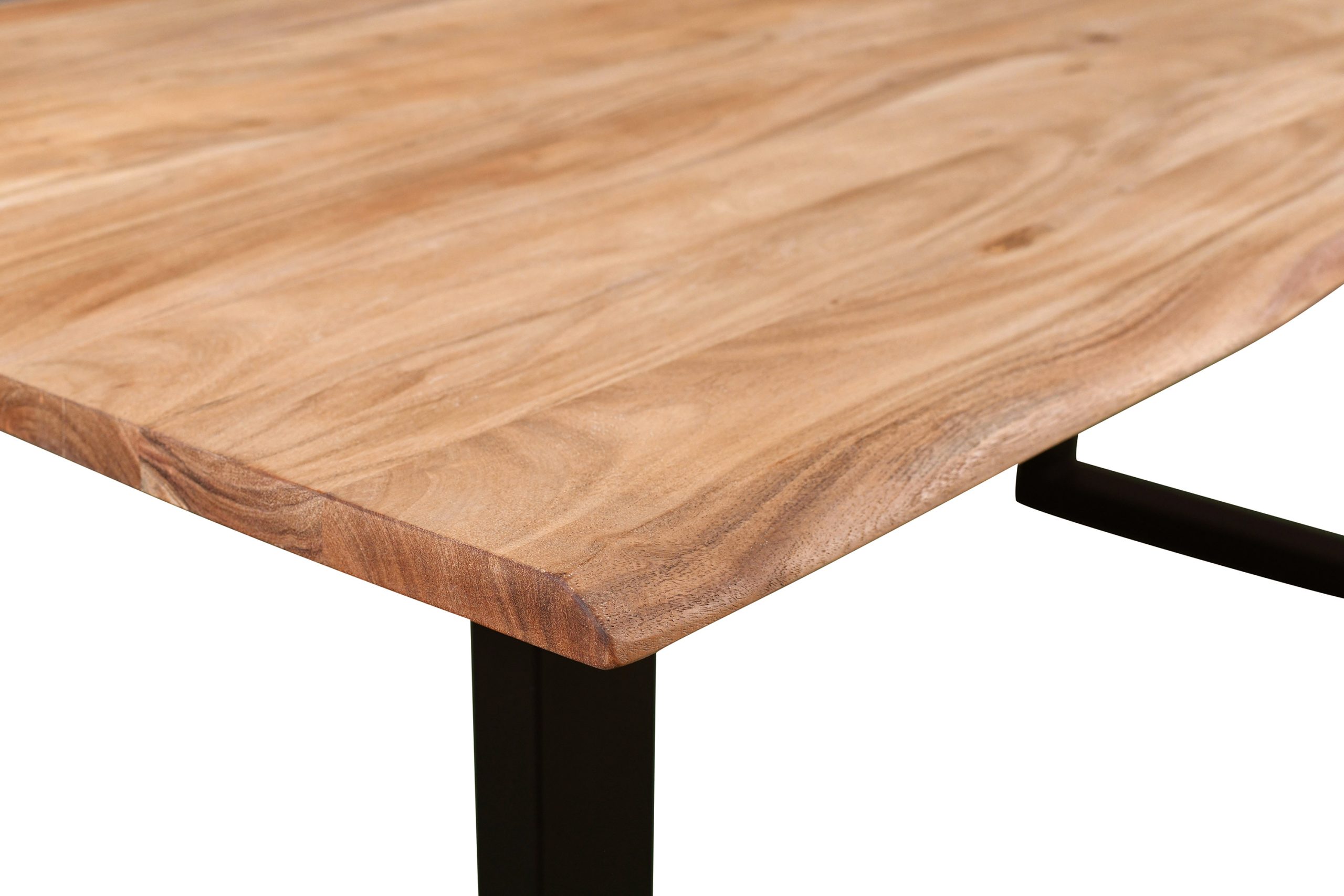 Die markante Naturholzplatte mit Baumkante harmoniert ideal mit dem Metallgestell in Kufenform. Der besondere Stil verleiht jedem Wohn- oder Esszimmer ein Gefühl von Wärme und Gemütlichkeit.