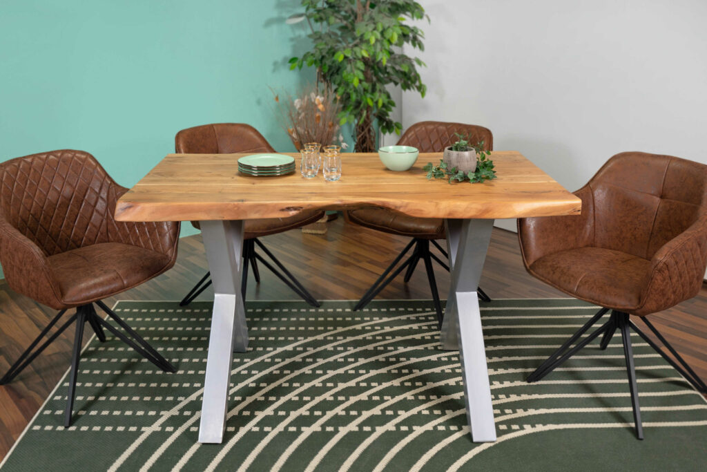 Die aufgedoppelte Tischkante (50 mm Gesamtstärke) verleiht dem Tisch nicht nur eine kraftvolle Optik, sondern sorgt auch für zusätzliche Stabilität. Das silberne X-Gestell aus Metall steht im spannenden Kontrast zur natürlichen Tischplatte – eine gelungene Verbindung aus Natur und urbanem Industrial-Look.