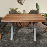 Die aufgedoppelte Tischkante (50 mm Gesamtstärke) verleiht dem Tisch nicht nur eine kraftvolle Optik, sondern sorgt auch für zusätzliche Stabilität. Das silberne X-Gestell aus Metall steht im spannenden Kontrast zur natürlichen Tischplatte – eine gelungene Verbindung aus Natur und urbanem Industrial-Look.