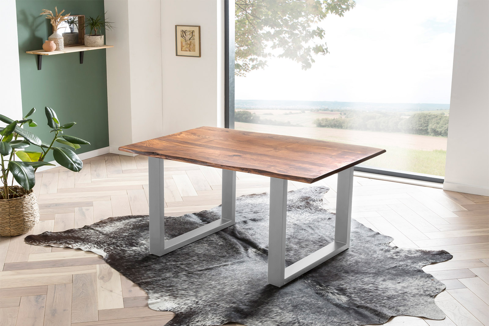 Esstisch Laurina | 120 x 80 cm | Akazienholz massiv + nougatfarben | echte Baumkante | U-Gestell Silber