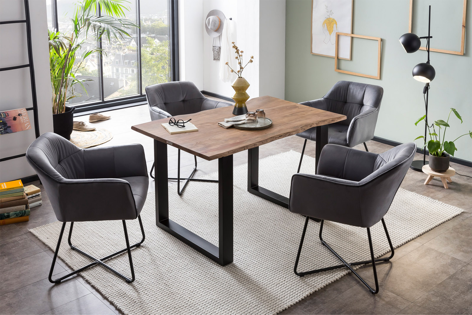 Massives Akazienholz trifft auf zeitgemäßes Design – Qualität und Handarbeit in perfekter Balance. Der handgefertigte Esstisch Laurina begeistert mit seiner stonefarben lackierten Massivholzplatte, echter Baumkante und einem stabilen U-Gestell aus Metall in Schwarz. Jede Tischplatte ist ein Unikat mit individueller Maserung und natürlichem Charakter – für ein Esszimmer, das Wärme und Stil ausstrahlt.