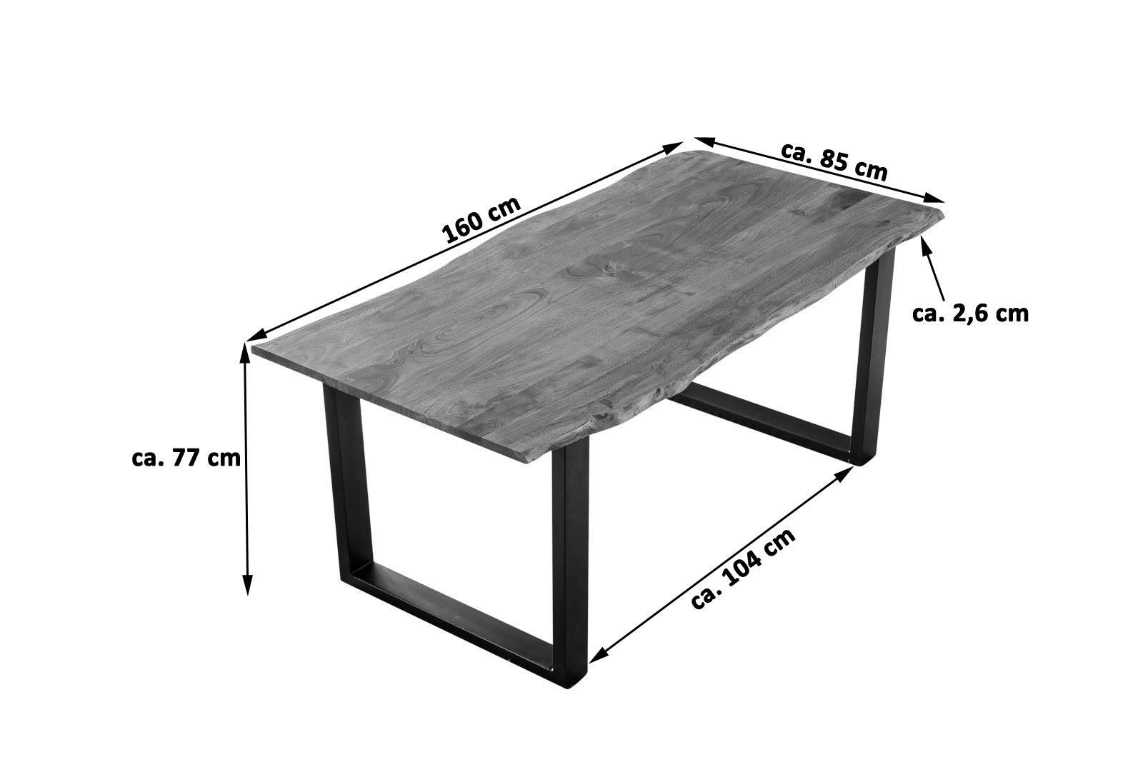 Länge: ca. 160 cm | Breite: ca. 85 cm | Höhe: ca. 77 cm | Tischplatte: ca. 2,6 cm