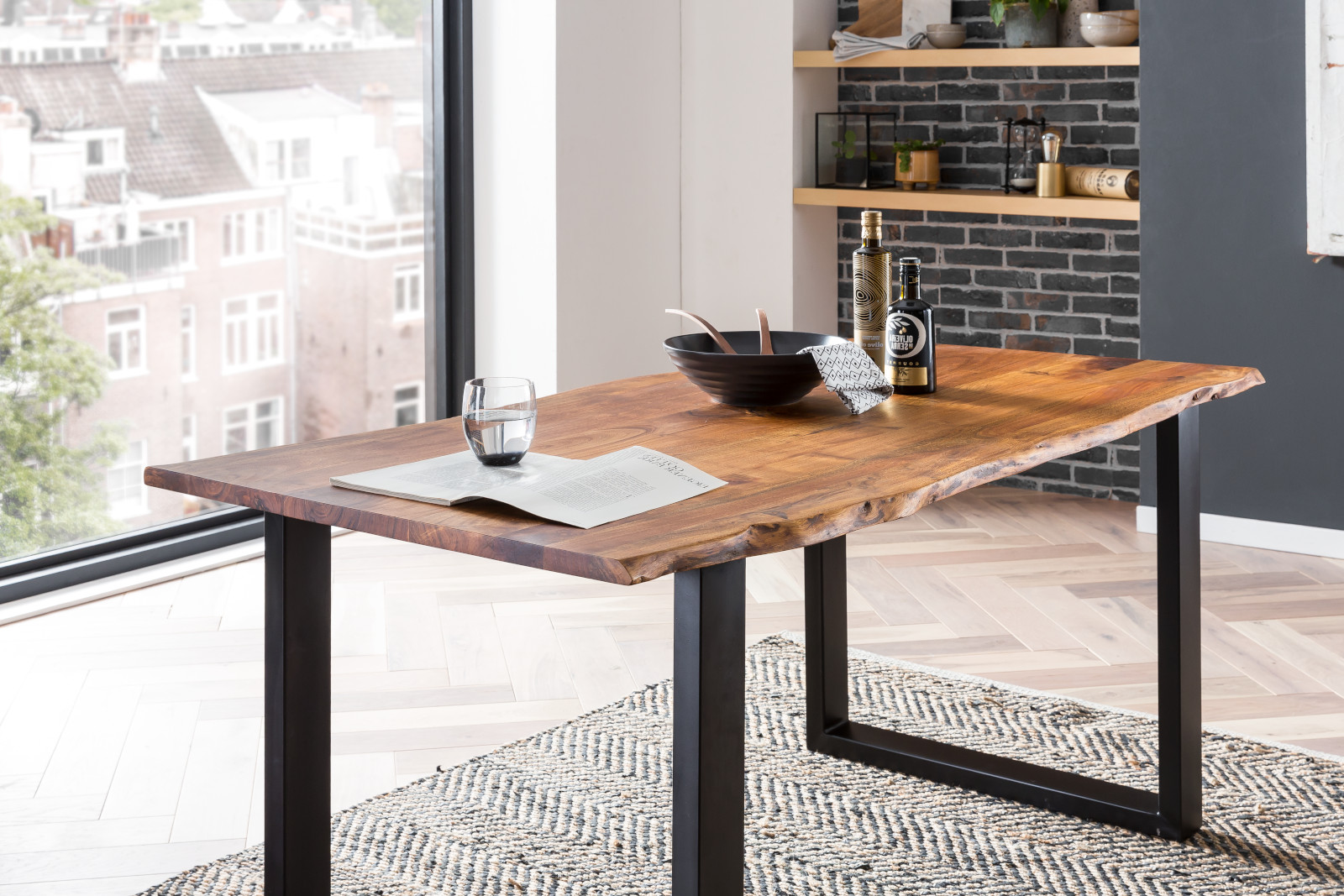 Esstisch Laurina | 160 x 85 cm | Akazienholz massiv + nougatfarben | echte Baumkante | U-Gestell Schwarz
