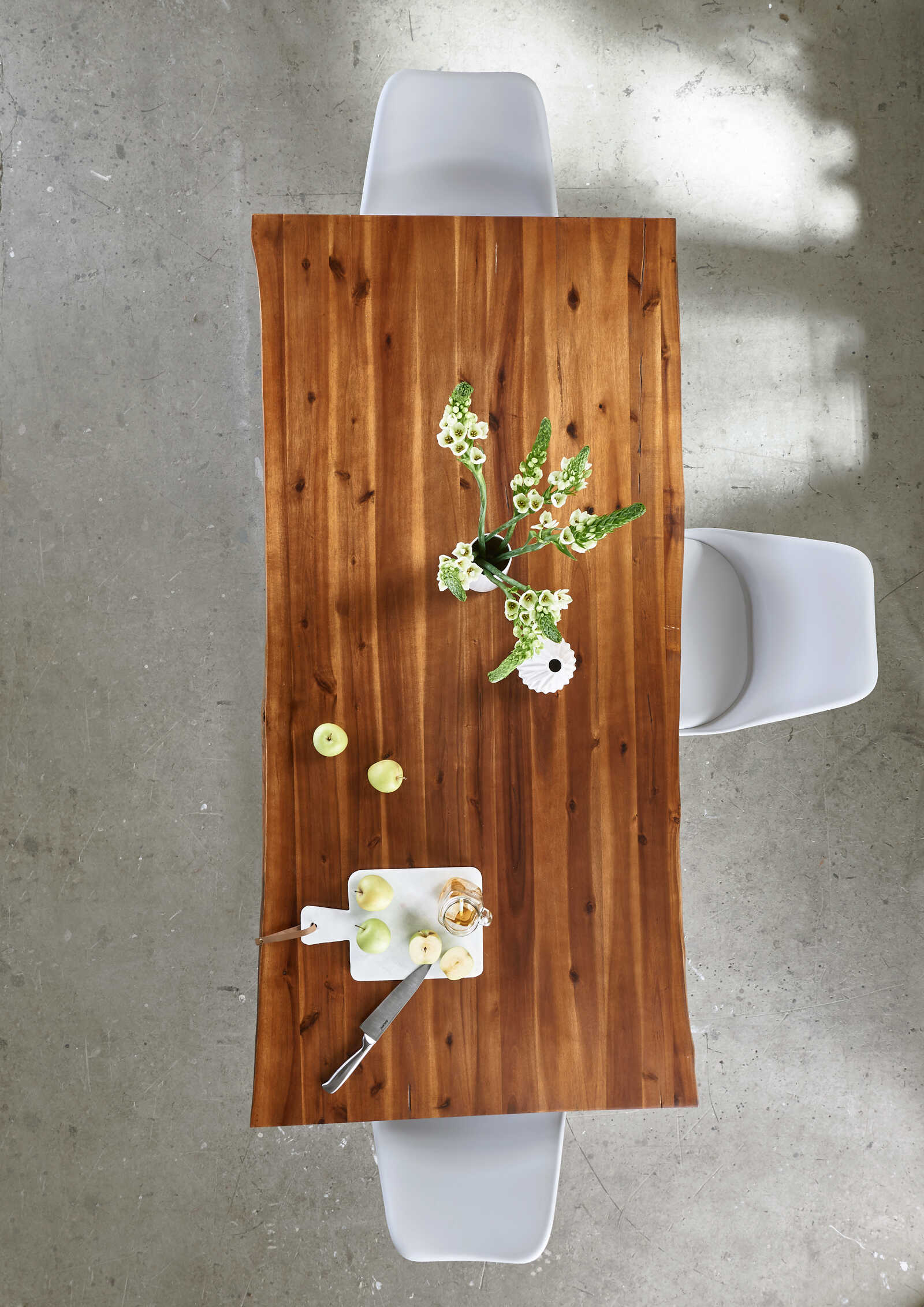 Der Esstisch Esra verbindet die warme Ausstrahlung massiven Akazienholzes mit der modernen Form einer authentischen Baumkante. Die 26 mm starke Tischplatte wird direkt aus dem Stamm geschnitten und behält so ihre ursprüngliche Linienführung – jedes Stück ist ein unverwechselbares Unikat mit natürlichem Charakter.