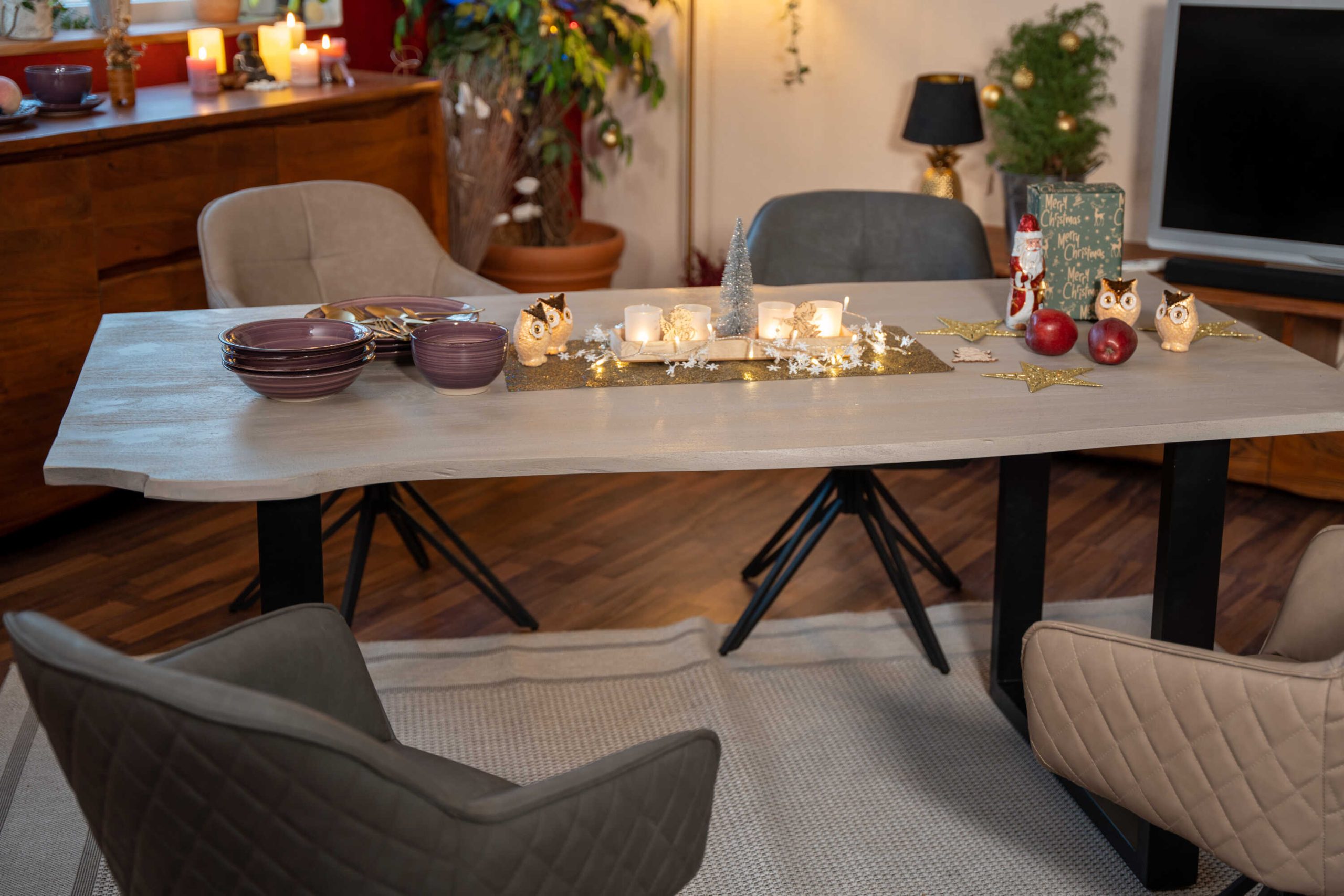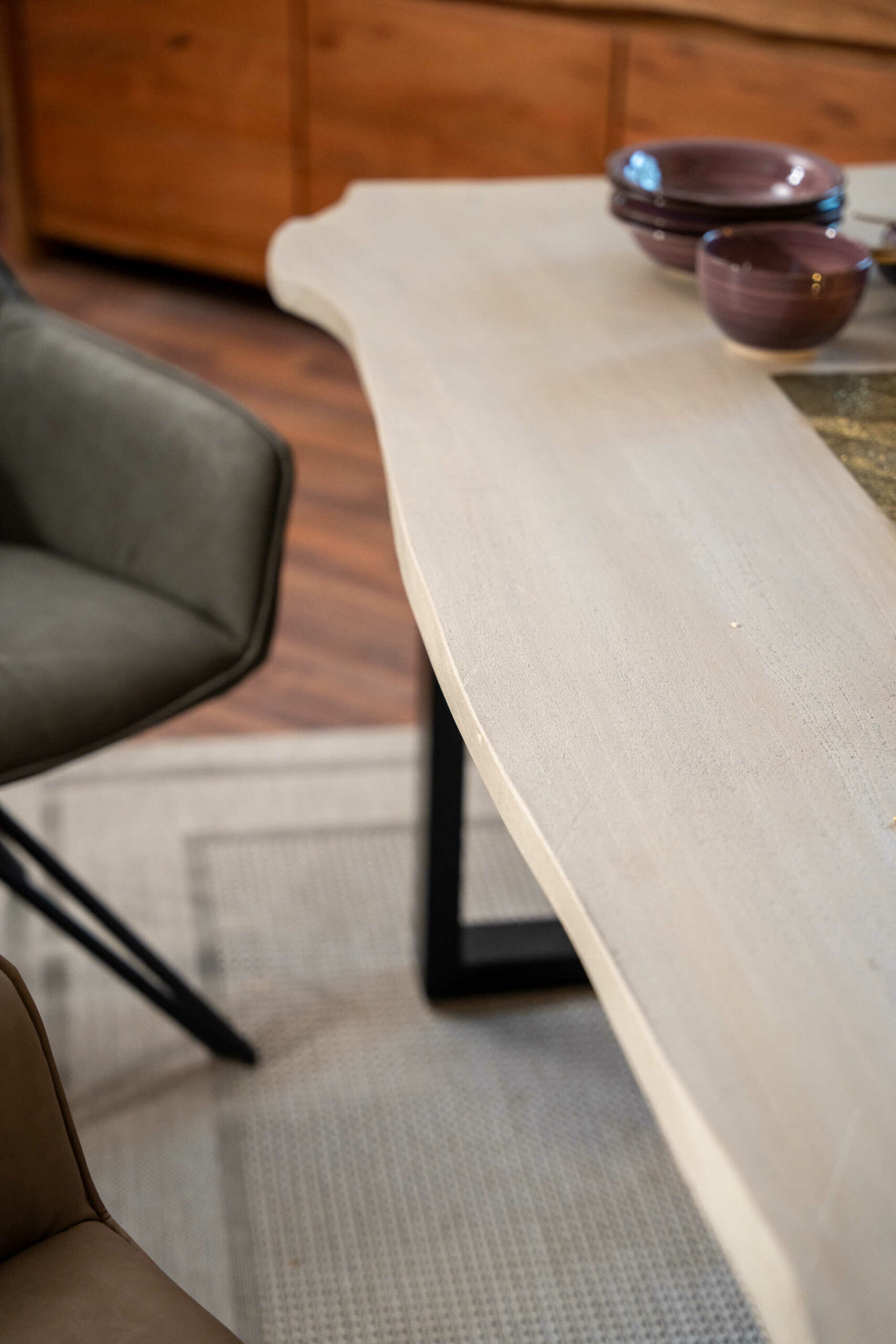 Baumkantentisch Grace, Esszimmertisch 160 x 85 cm, Massivholz Akazie, grau & sandgestrahlt / U-Gestell schwarz