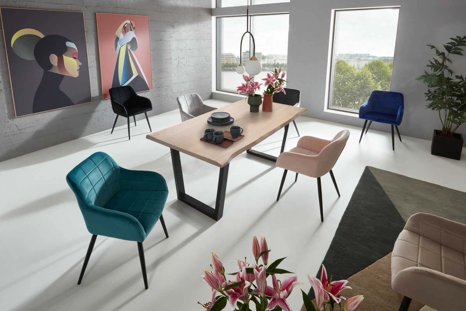 Unser trendiger Esstisch “Grace“ überzeugt durch eine perfekt gelungene Kombination aus Natürlichkeit und stylischer Moderne. Besonderes Highlight des Esszimmertisches sind die Tischkanten, die den natürlichen Formen eines Baumes entsprechen und direkt aus dem Baumstamm geschnitten wurden. Das V-förmige Gestell sorgt für einen gelungenen Kontrast, welcher dem Massivholz-Tisch einen Hauch von industriellem Look verleiht.